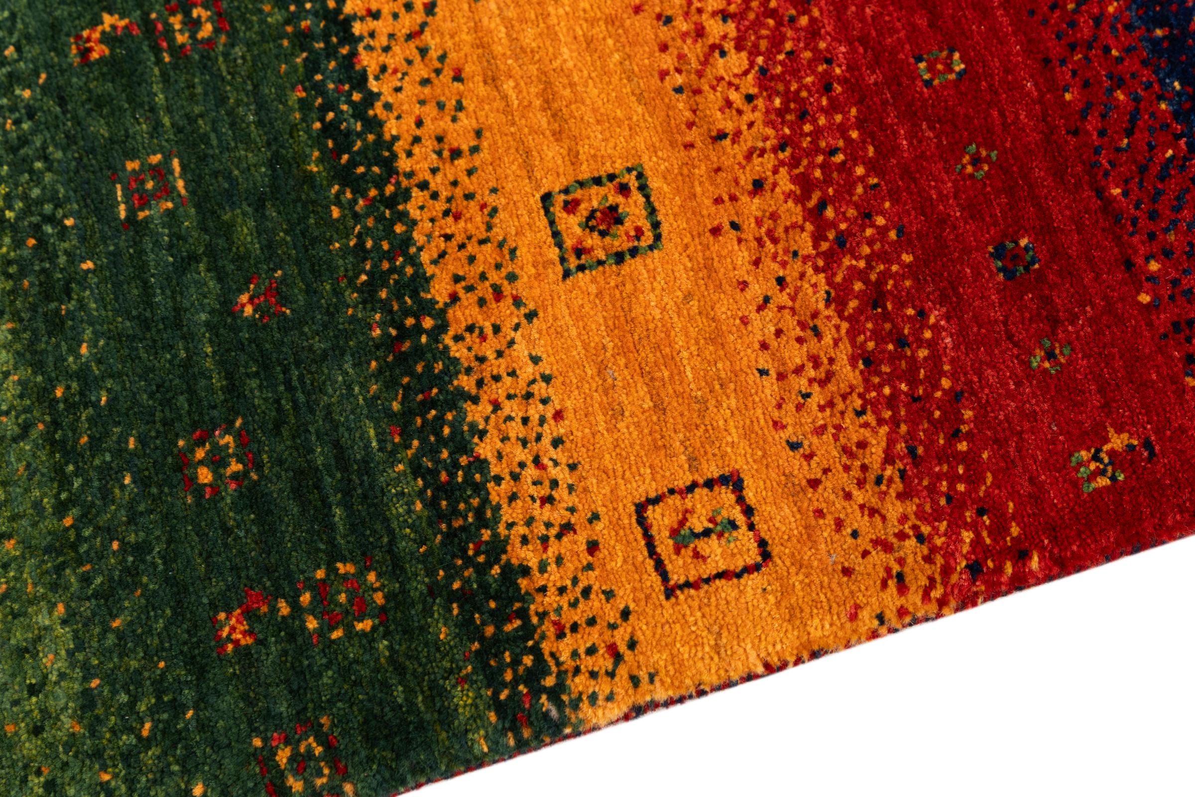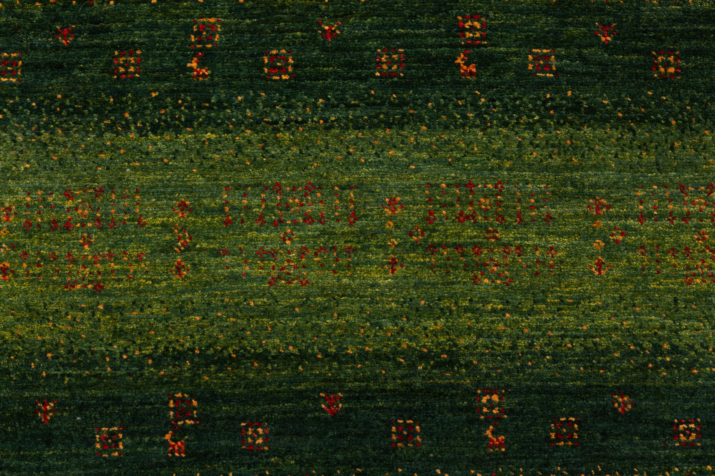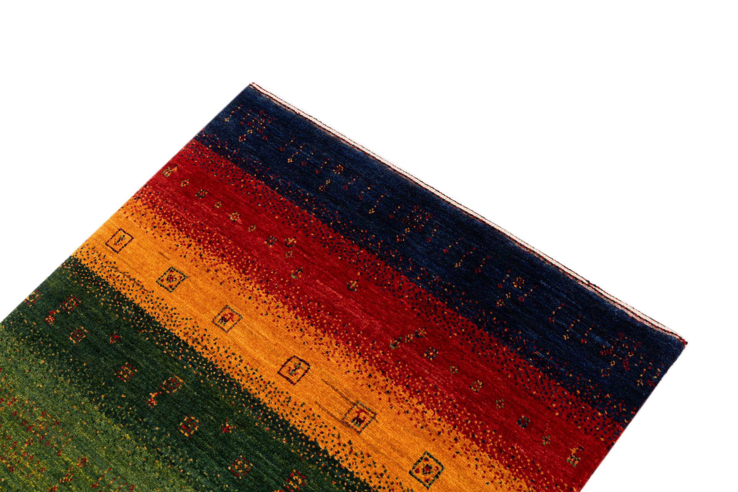Ce magnifique tapis est un Gabbeh persan et fait donc partie des tapis Gabbeh de la plus haute qualité. Les tapis sont noués par des nomades ou des semi-nomades en Iran selon un savoir-faire traditionnel. Les motifs simples sont pour la plupart inspirés par l'environnement local des nomades. Par exemple, on peut trouver des chameaux, des arbres ou des buissons sur les tapis traditionnels. Les tapis de Gabbeh persan sont faits de laine provenant de troupeaux de moutons élevés localement. La laine est donc encore en grande partie filée à la main. Ainsi, chacun de ces tapis orientaux incarne un caractère unique de culture ancienne.