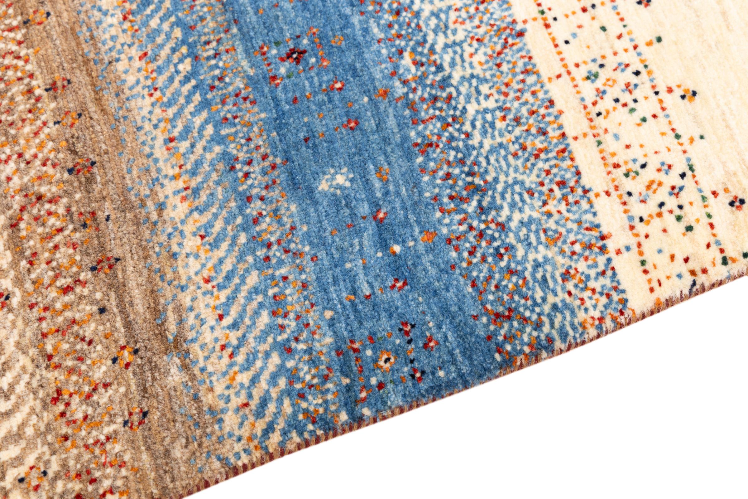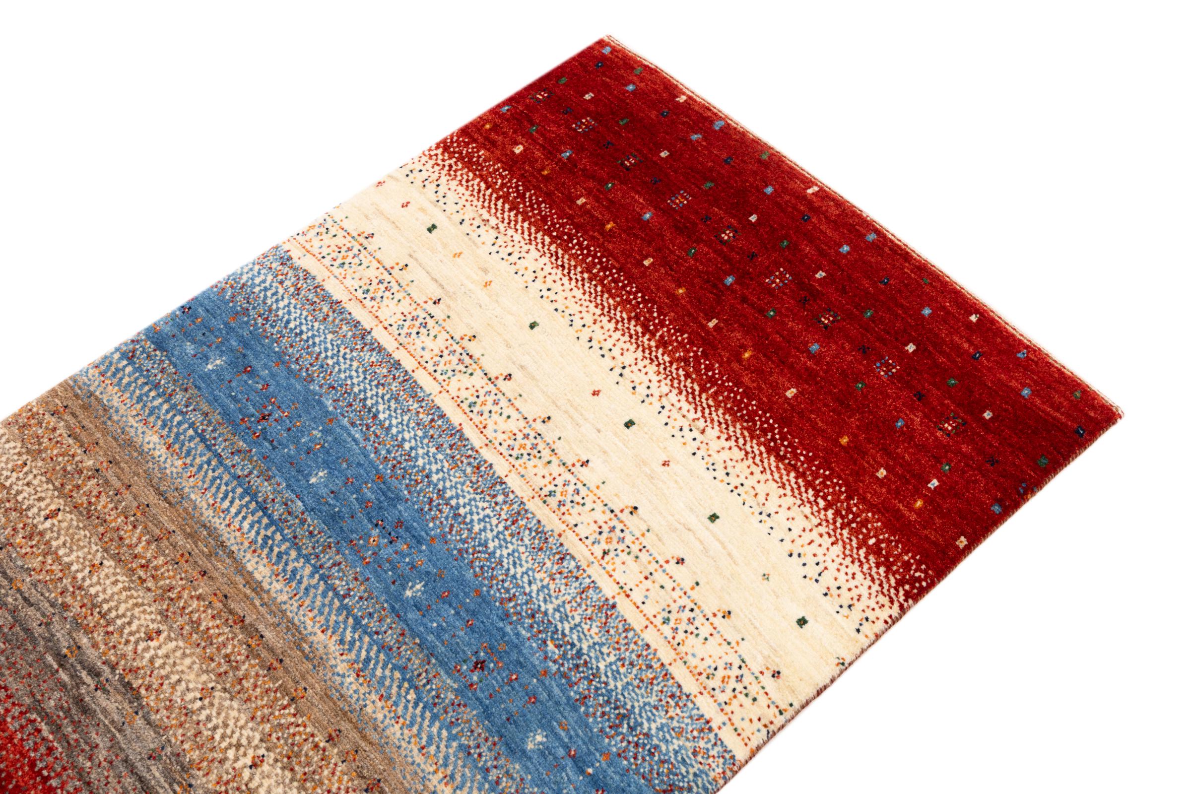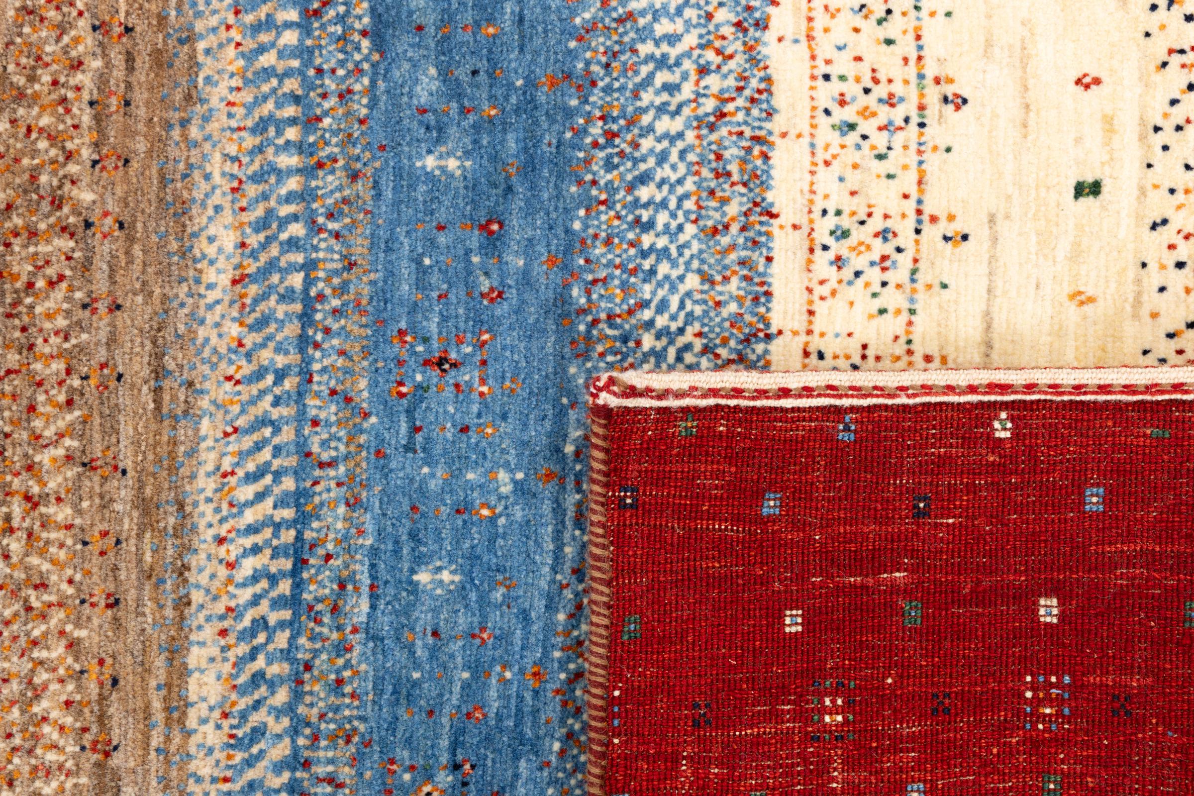 Ce magnifique tapis est un Gabbeh persan et fait donc partie des tapis Gabbeh de la plus haute qualité. Les tapis sont noués par des nomades ou des semi-nomades en Iran selon un savoir-faire traditionnel. Les motifs simples sont pour la plupart inspirés par l'environnement local des nomades. Par exemple, on peut trouver des chameaux, des arbres ou des buissons sur les tapis traditionnels. Les tapis de Gabbeh persan sont faits de laine provenant de troupeaux de moutons élevés localement. La laine est donc encore en grande partie filée à la main. Ainsi, chacun de ces tapis orientaux incarne un caractère unique de culture ancienne.