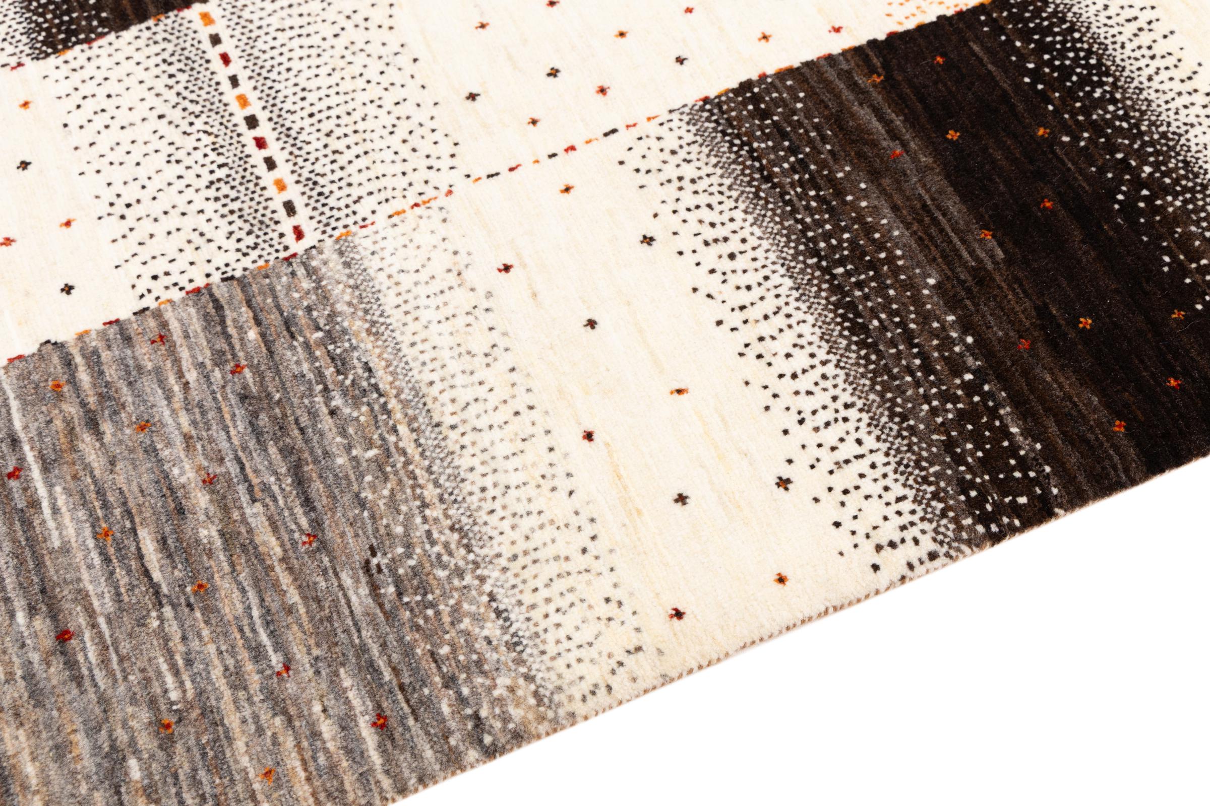 Ce magnifique tapis est un Gabbeh persan et fait donc partie des tapis Gabbeh de la plus haute qualité. Les tapis sont noués par des nomades ou des semi-nomades en Iran selon un savoir-faire traditionnel. Les motifs simples sont pour la plupart inspirés par l'environnement local des nomades. Par exemple, on peut trouver des chameaux, des arbres ou des buissons sur les tapis traditionnels. Les tapis de Gabbeh persan sont faits de laine provenant de troupeaux de moutons élevés localement. La laine est donc encore en grande partie filée à la main. Ainsi, chacun de ces tapis orientaux incarne un caractère unique de culture ancienne.