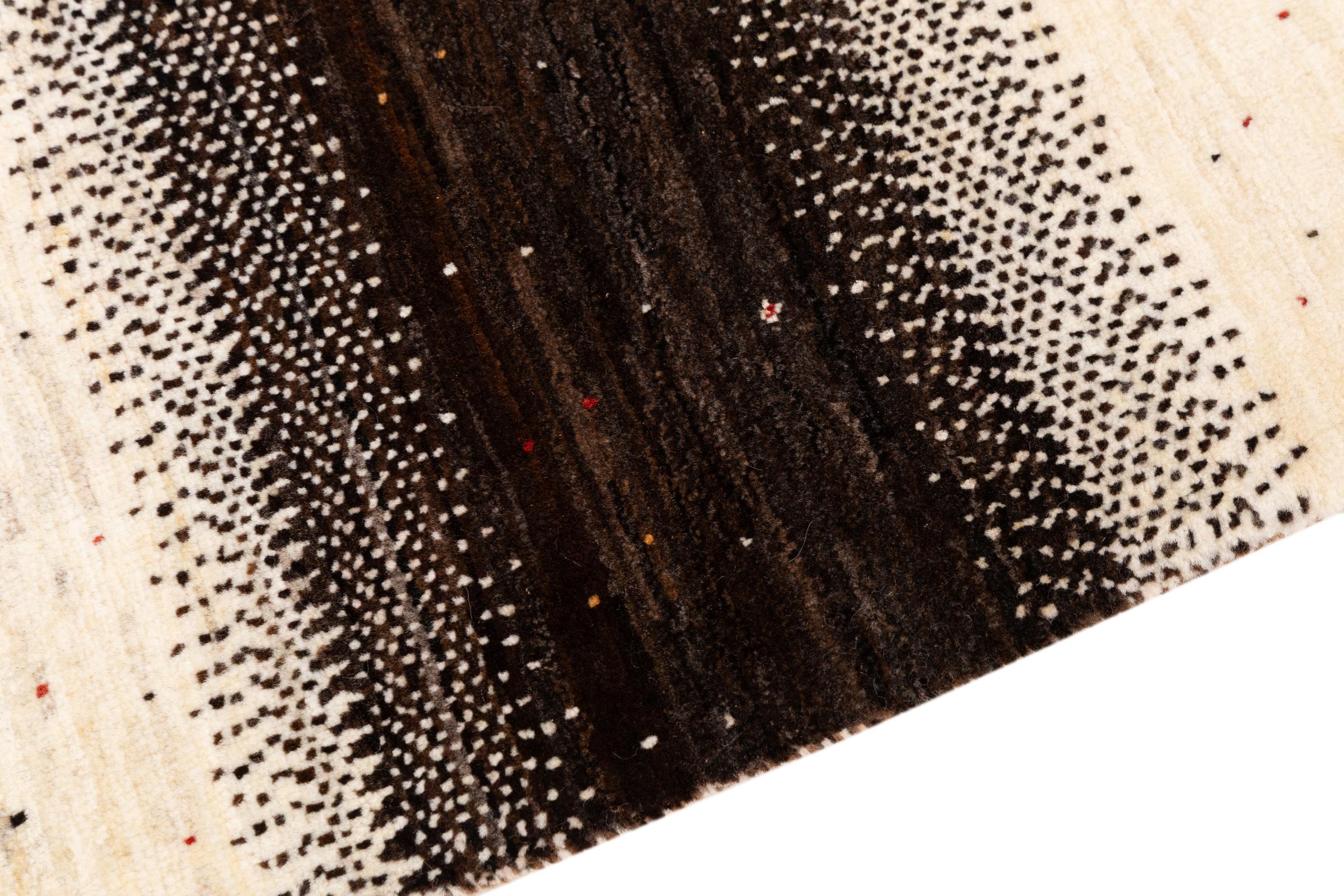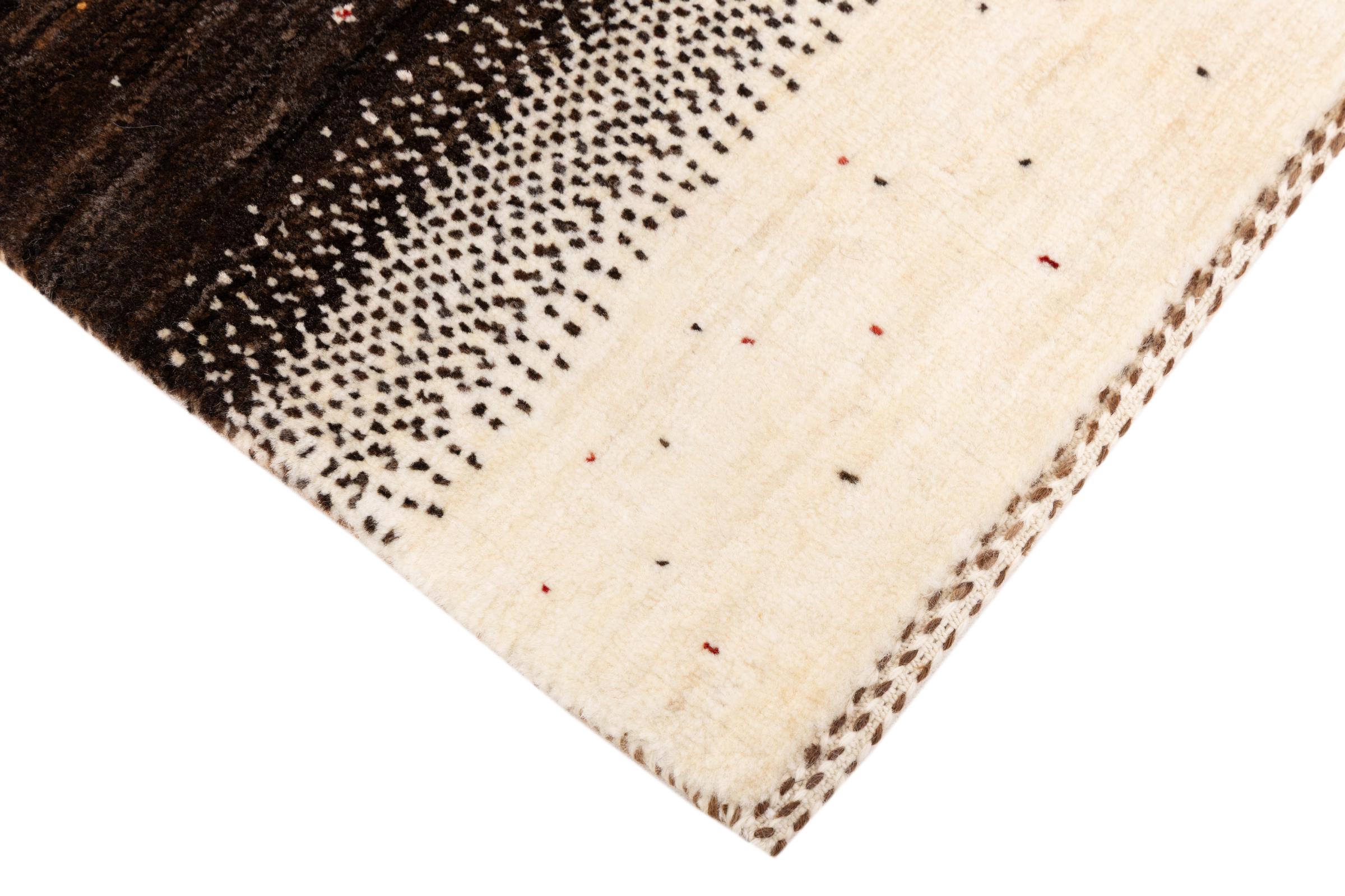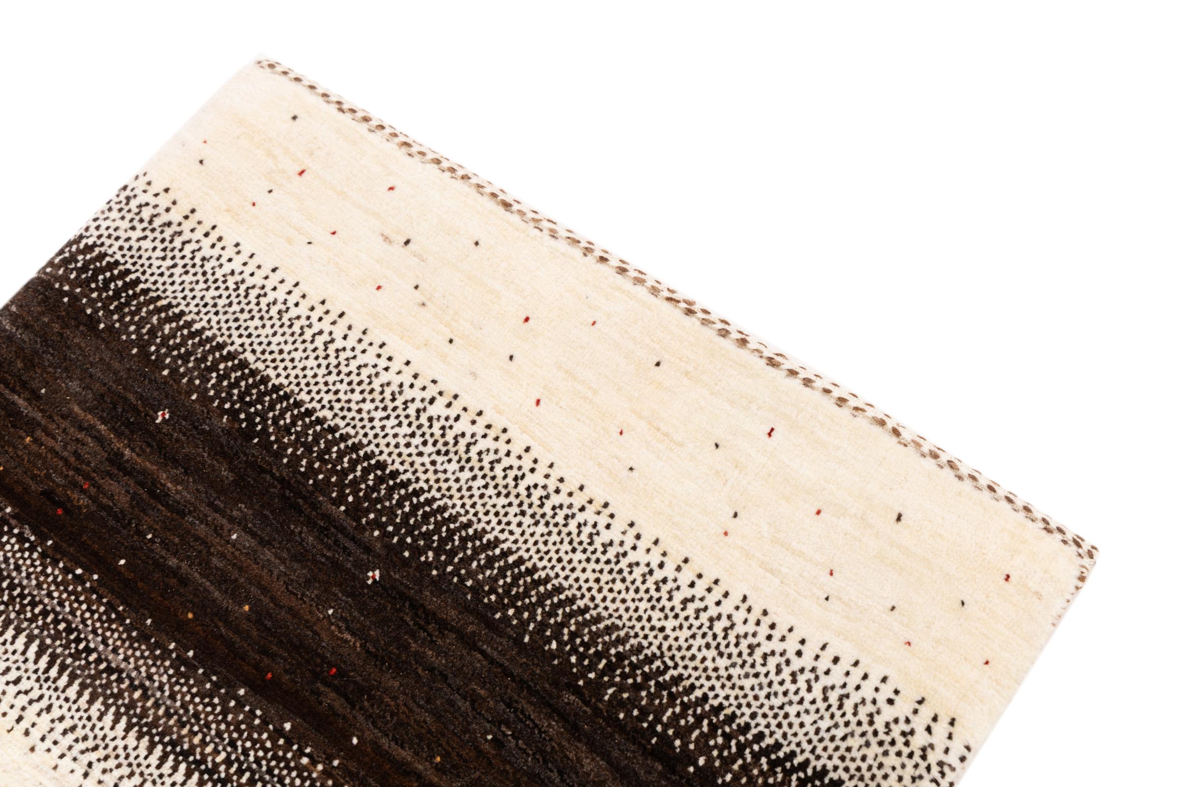 Ce magnifique tapis est un Gabbeh persan et fait donc partie des tapis Gabbeh de la plus haute qualité. Les tapis sont noués par des nomades ou des semi-nomades en Iran selon un savoir-faire traditionnel. Les motifs simples sont pour la plupart inspirés par l'environnement local des nomades. Par exemple, on peut trouver des chameaux, des arbres ou des buissons sur les tapis traditionnels. Les tapis de Gabbeh persan sont faits de laine provenant de troupeaux de moutons élevés localement. La laine est donc encore en grande partie filée à la main. Ainsi, chacun de ces tapis orientaux incarne un caractère unique de culture ancienne.