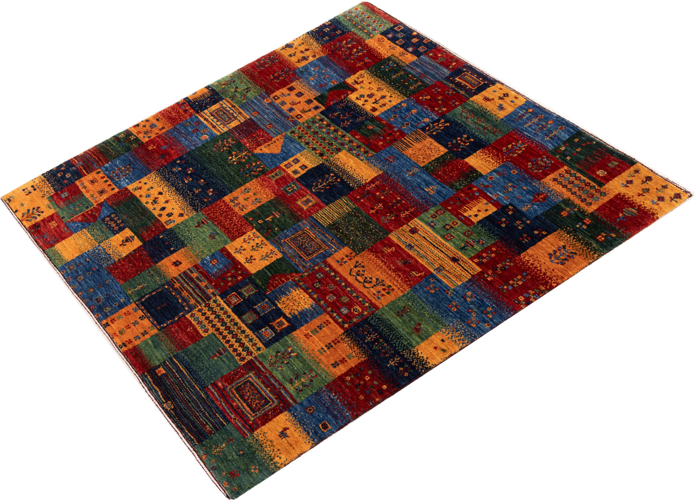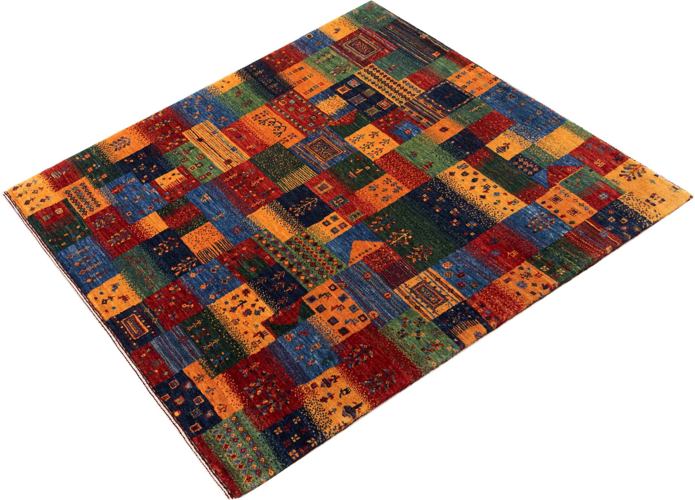 Ce magnifique tapis est un Gabbeh persan et fait donc partie des tapis Gabbeh de la plus haute qualité. Les tapis sont noués par des nomades ou des semi-nomades en Iran selon un savoir-faire traditionnel. Les motifs simples sont pour la plupart inspirés par l'environnement local des nomades. Par exemple, on peut trouver des chameaux, des arbres ou des buissons sur les tapis traditionnels. Les tapis de Gabbeh persan sont faits de laine provenant de troupeaux de moutons élevés localement. La laine est donc encore en grande partie filée à la main. Ainsi, chacun de ces tapis orientaux incarne un caractère unique de culture ancienne.