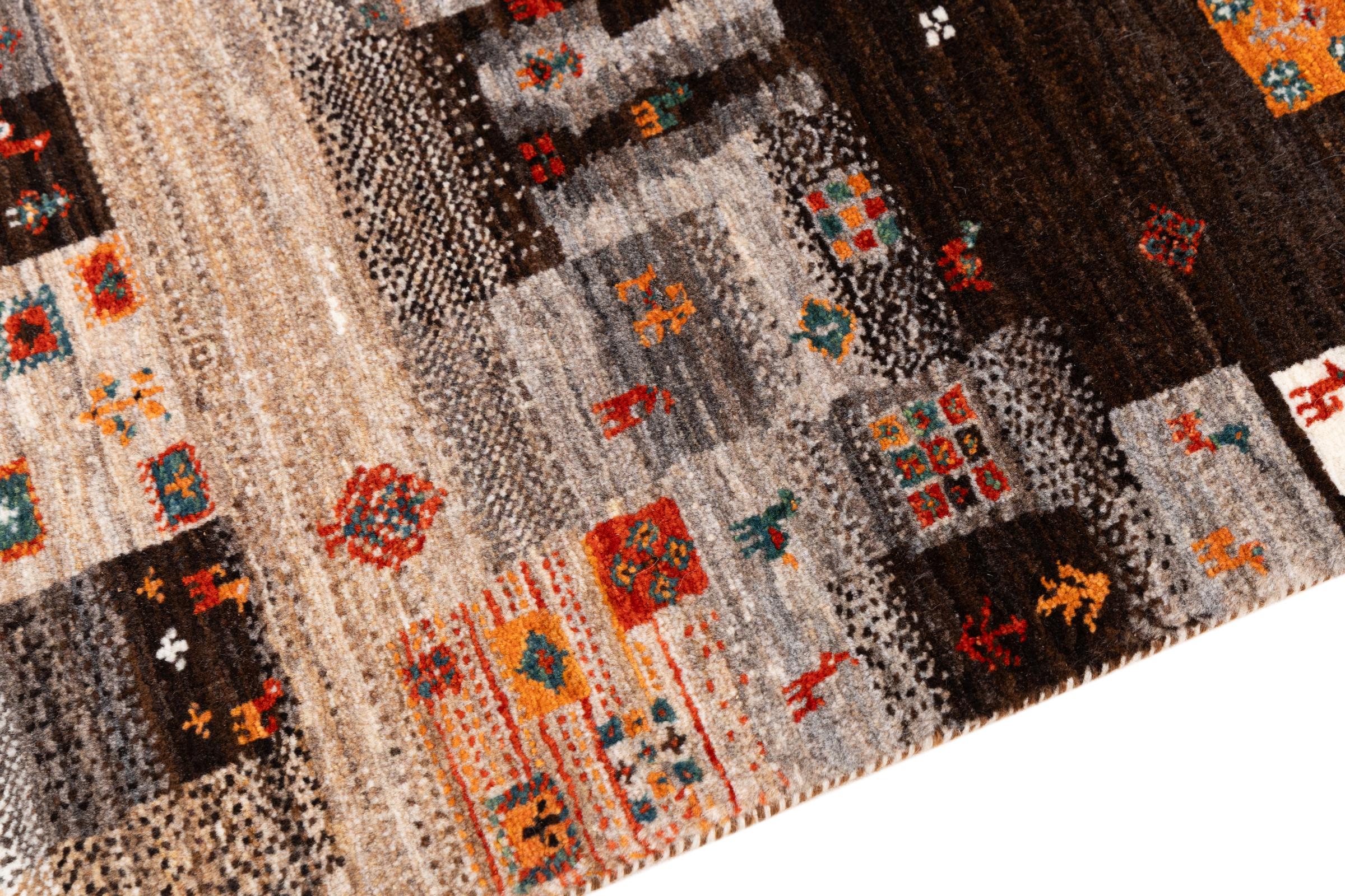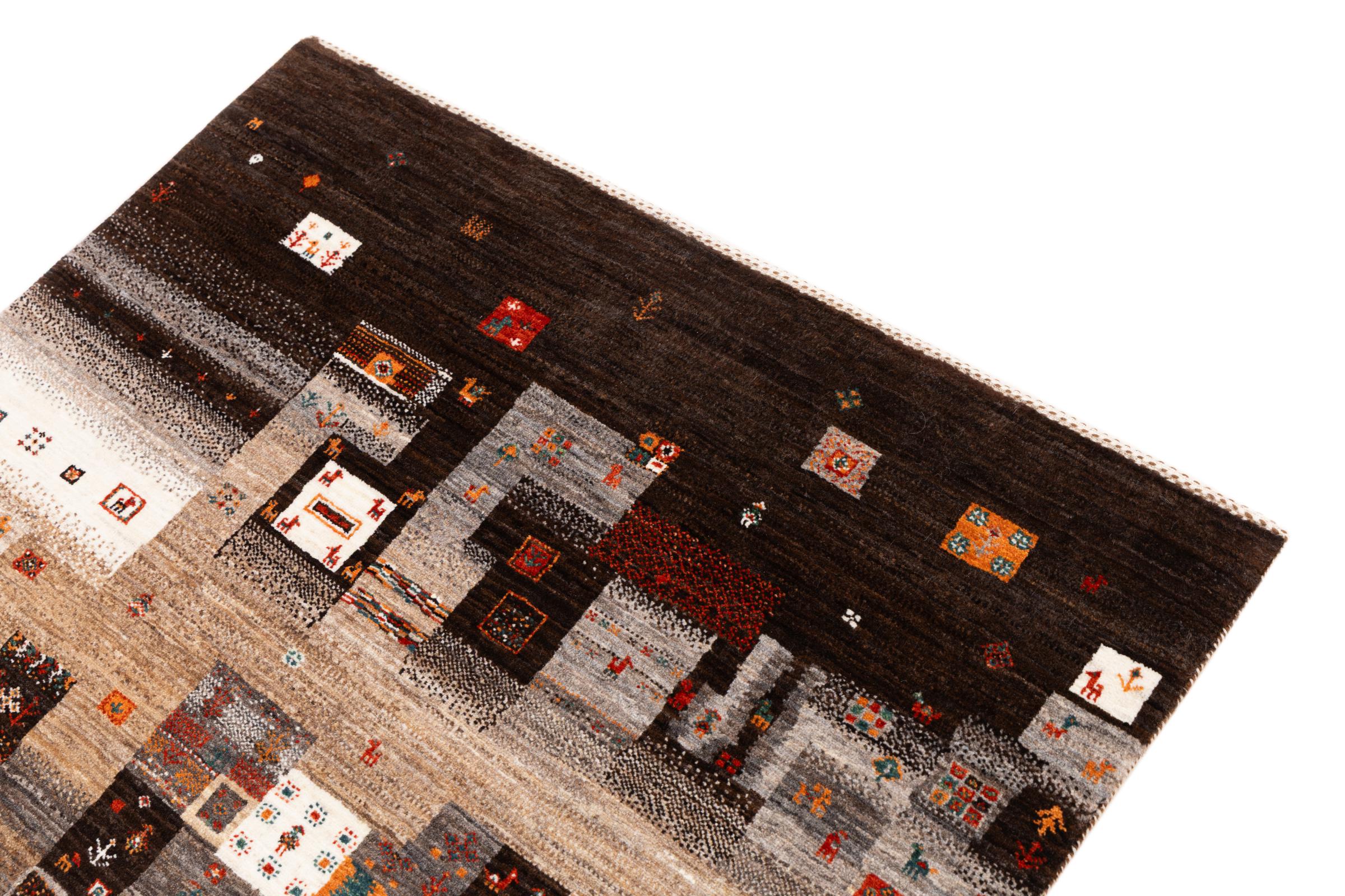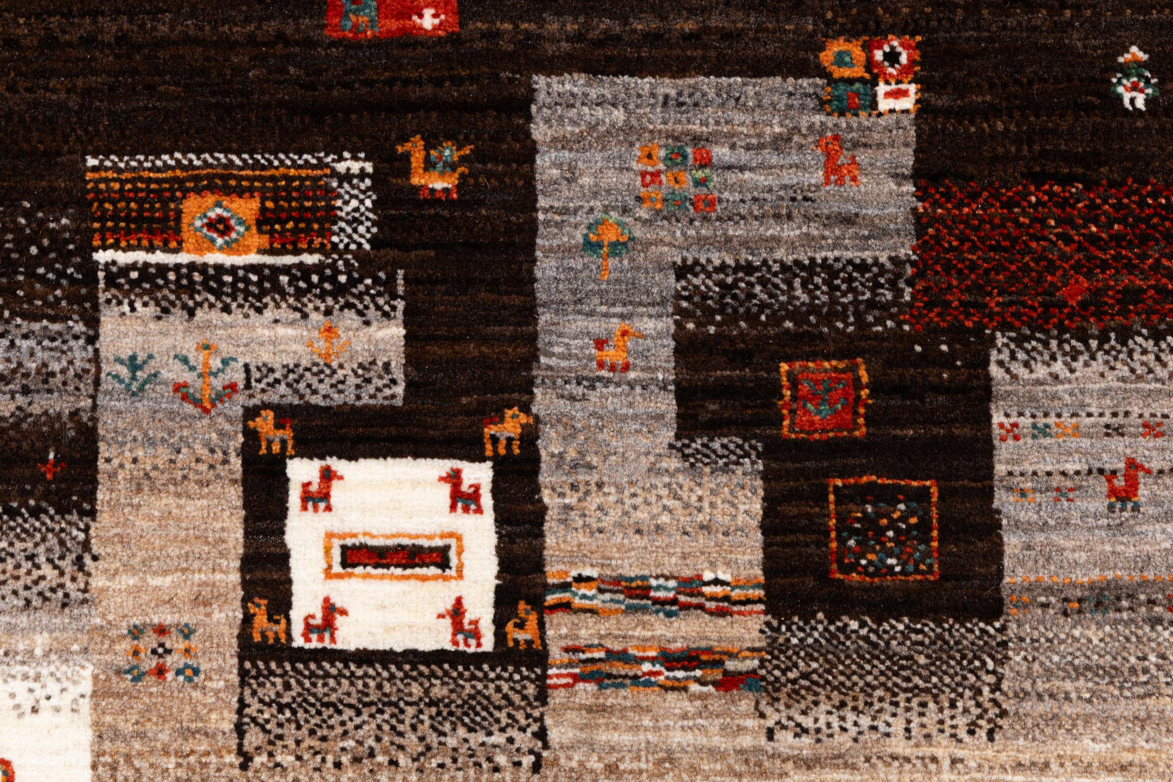 Ce magnifique tapis est un Gabbeh persan et fait donc partie des tapis Gabbeh de la plus haute qualité. Les tapis sont noués par des nomades ou des semi-nomades en Iran selon un savoir-faire traditionnel. Les motifs simples sont pour la plupart inspirés par l'environnement local des nomades. Par exemple, on peut trouver des chameaux, des arbres ou des buissons sur les tapis traditionnels. Les tapis de Gabbeh persan sont faits de laine provenant de troupeaux de moutons élevés localement. La laine est donc encore en grande partie filée à la main. Ainsi, chacun de ces tapis orientaux incarne un caractère unique de culture ancienne.