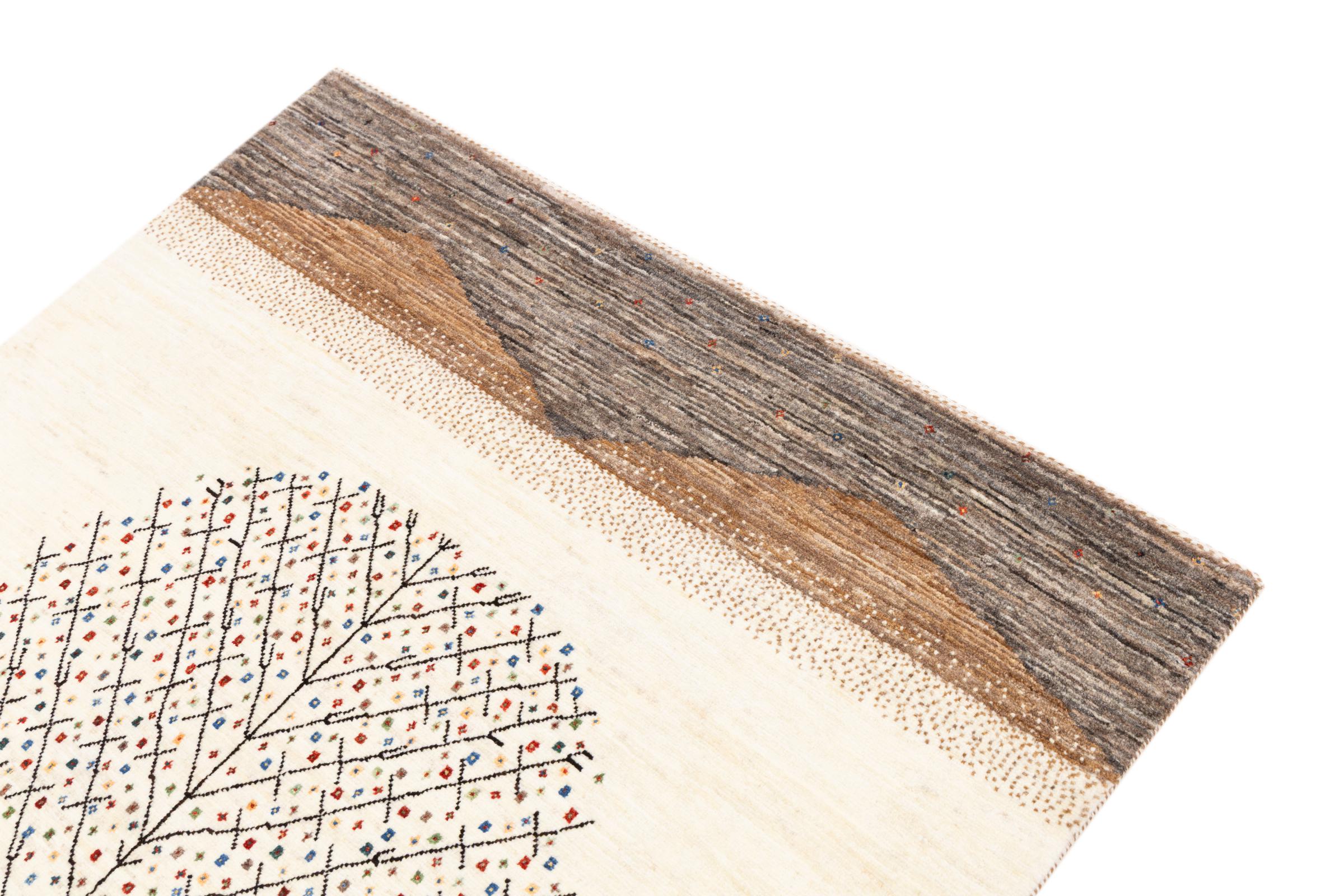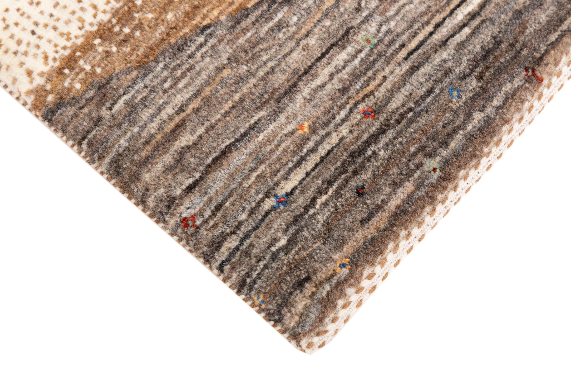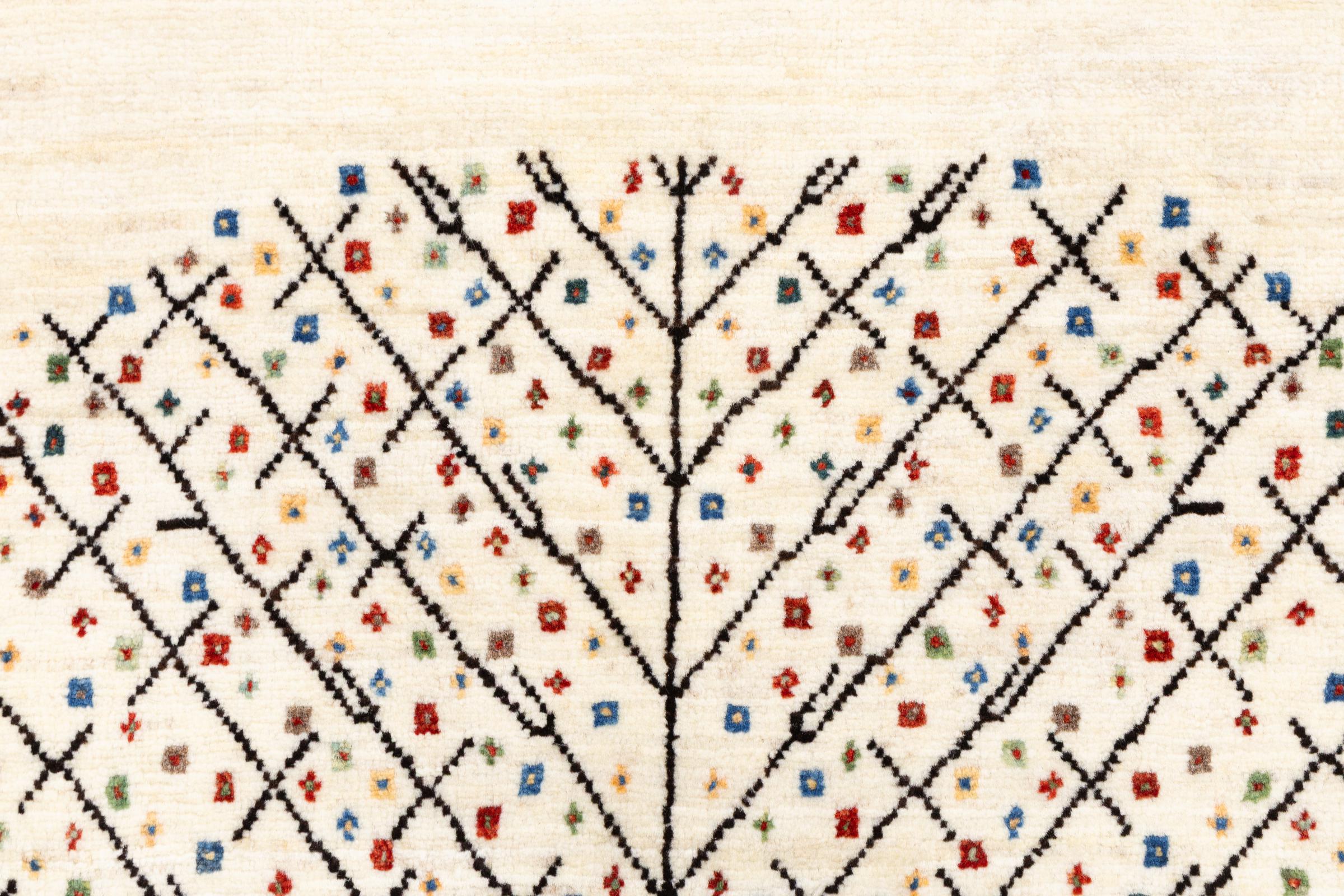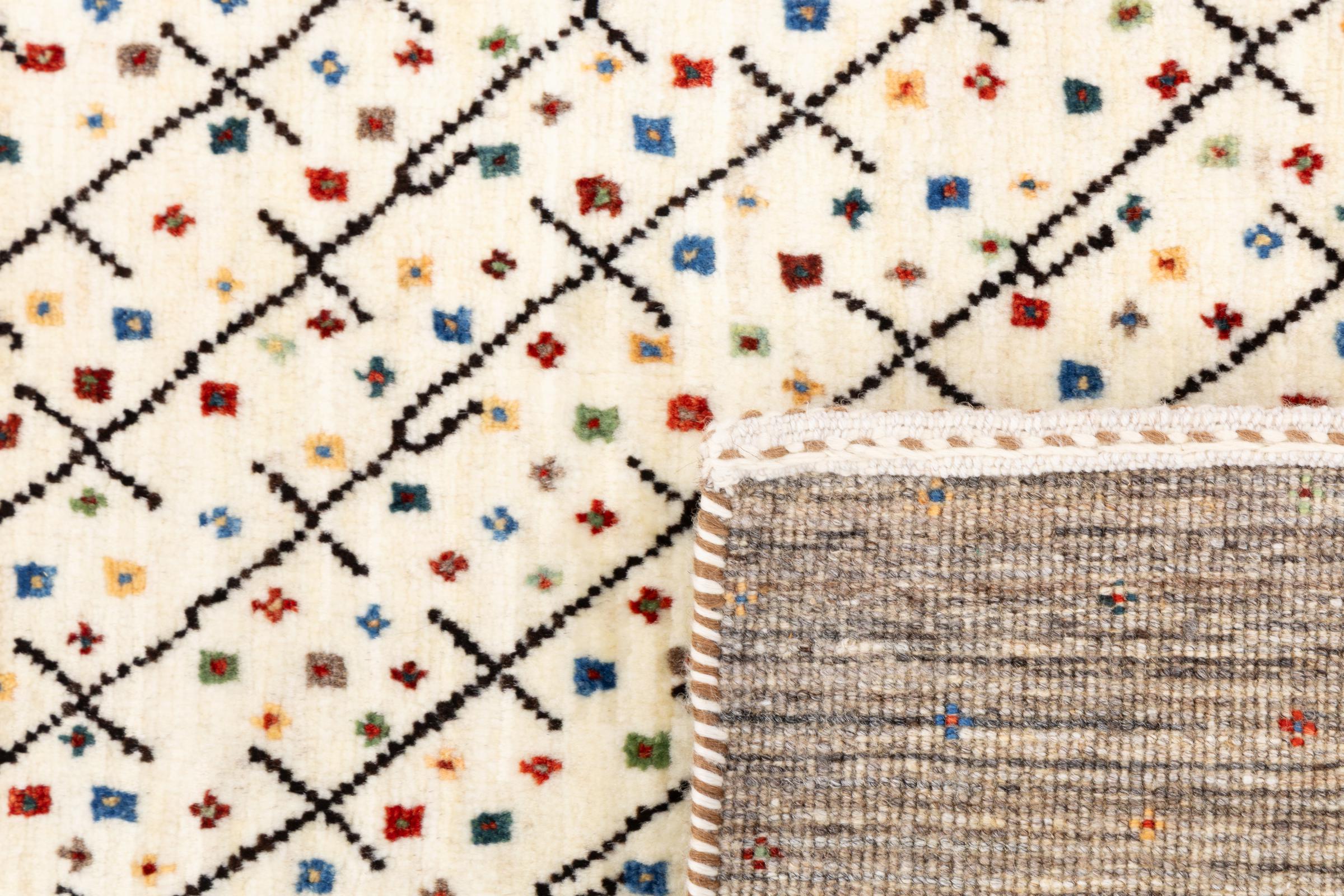 Ce magnifique tapis est un Gabbeh persan et fait donc partie des tapis Gabbeh de la plus haute qualité. Les tapis sont noués par des nomades ou des semi-nomades en Iran selon un savoir-faire traditionnel. Les motifs simples sont pour la plupart inspirés par l'environnement local des nomades. Par exemple, on peut trouver des chameaux, des arbres ou des buissons sur les tapis traditionnels. Les tapis de Gabbeh persan sont faits de laine provenant de troupeaux de moutons élevés localement. La laine est donc encore en grande partie filée à la main. Ainsi, chacun de ces tapis orientaux incarne un caractère unique de culture ancienne.