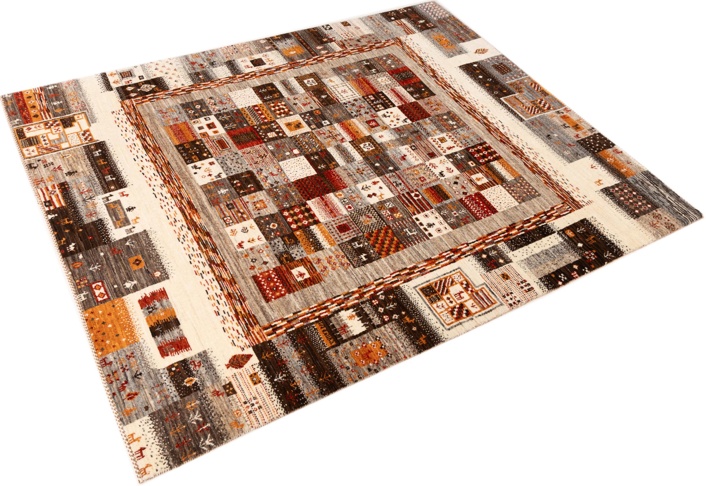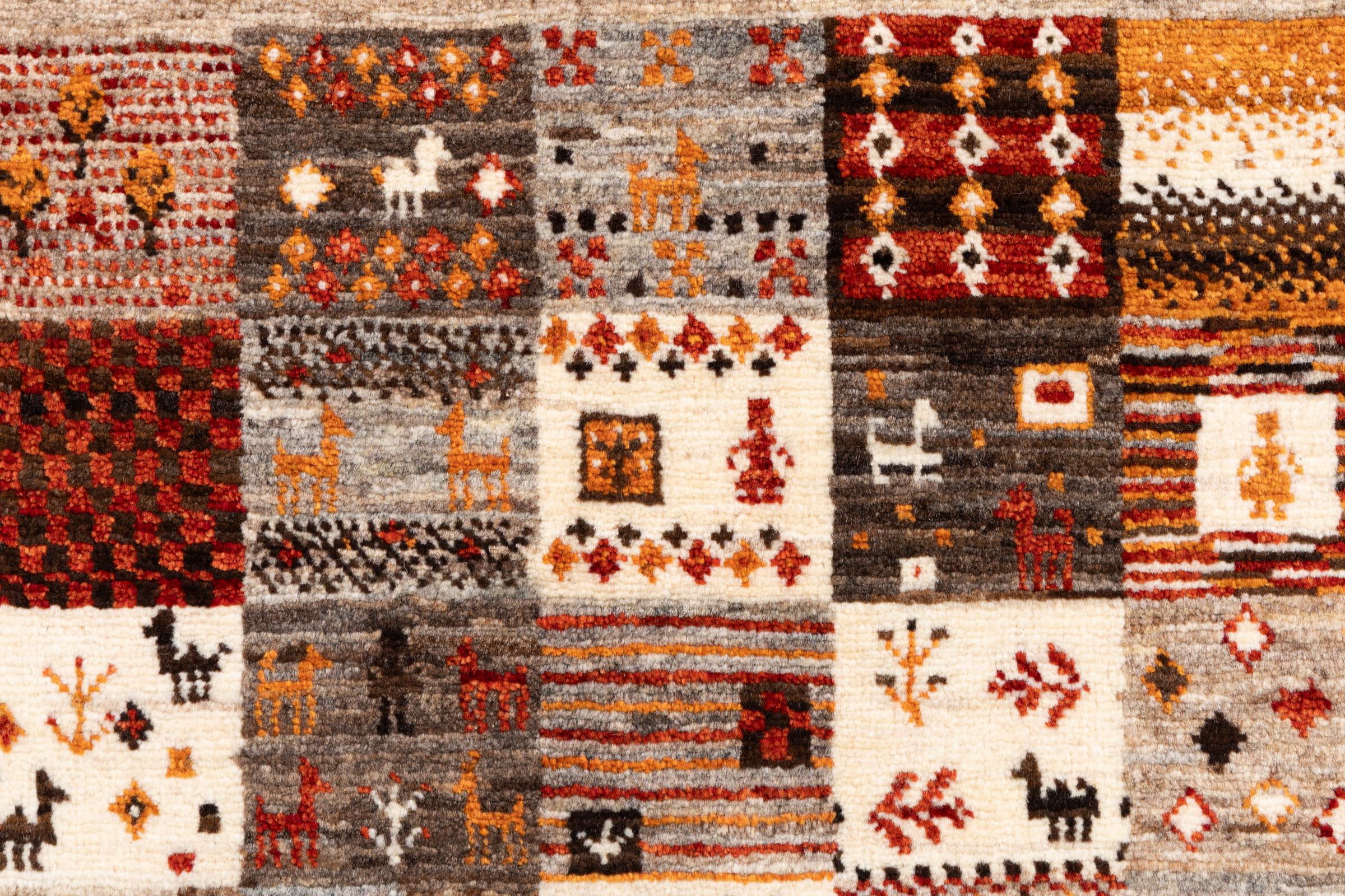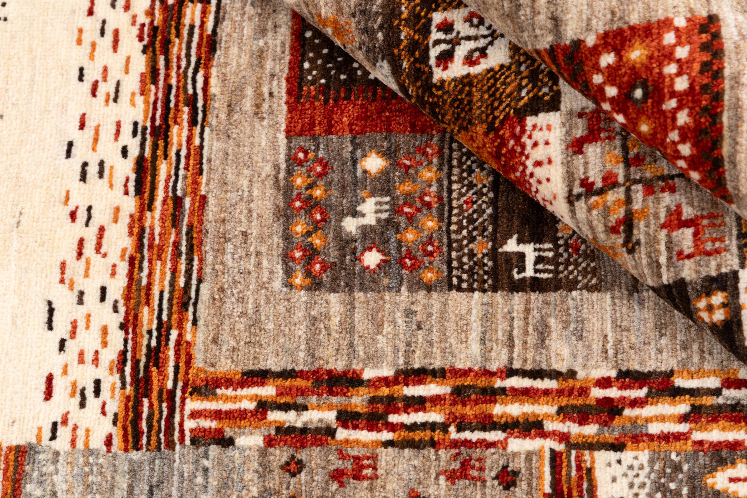 Ce magnifique tapis est un Gabbeh persan et fait donc partie des tapis Gabbeh de la plus haute qualité. Les tapis sont noués par des nomades ou des semi-nomades en Iran selon un savoir-faire traditionnel. Les motifs simples sont pour la plupart inspirés par l'environnement local des nomades. Par exemple, on peut trouver des chameaux, des arbres ou des buissons sur les tapis traditionnels. Les tapis de Gabbeh persan sont faits de laine provenant de troupeaux de moutons élevés localement. La laine est donc encore en grande partie filée à la main. Ainsi, chacun de ces tapis orientaux incarne un caractère unique de culture ancienne.