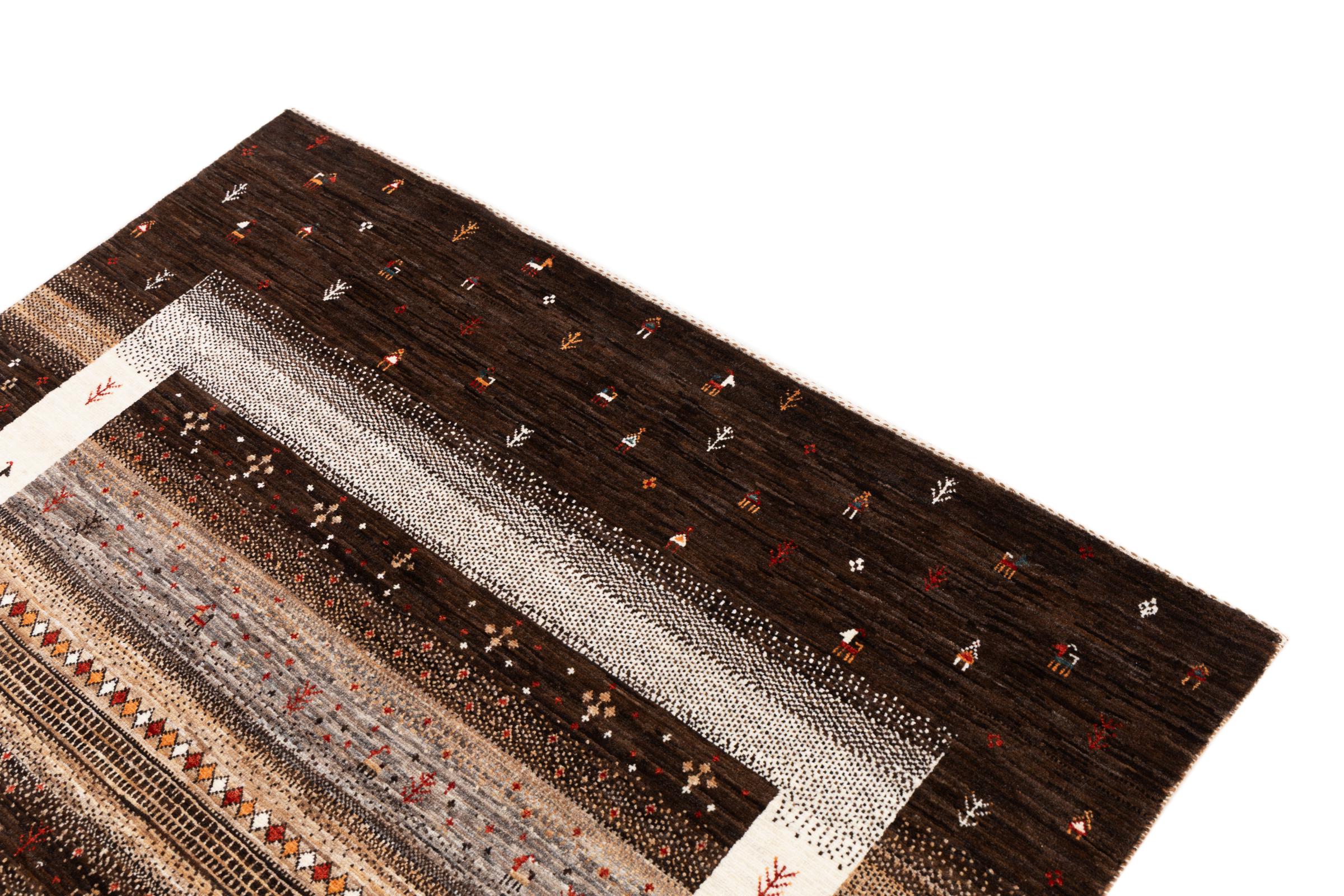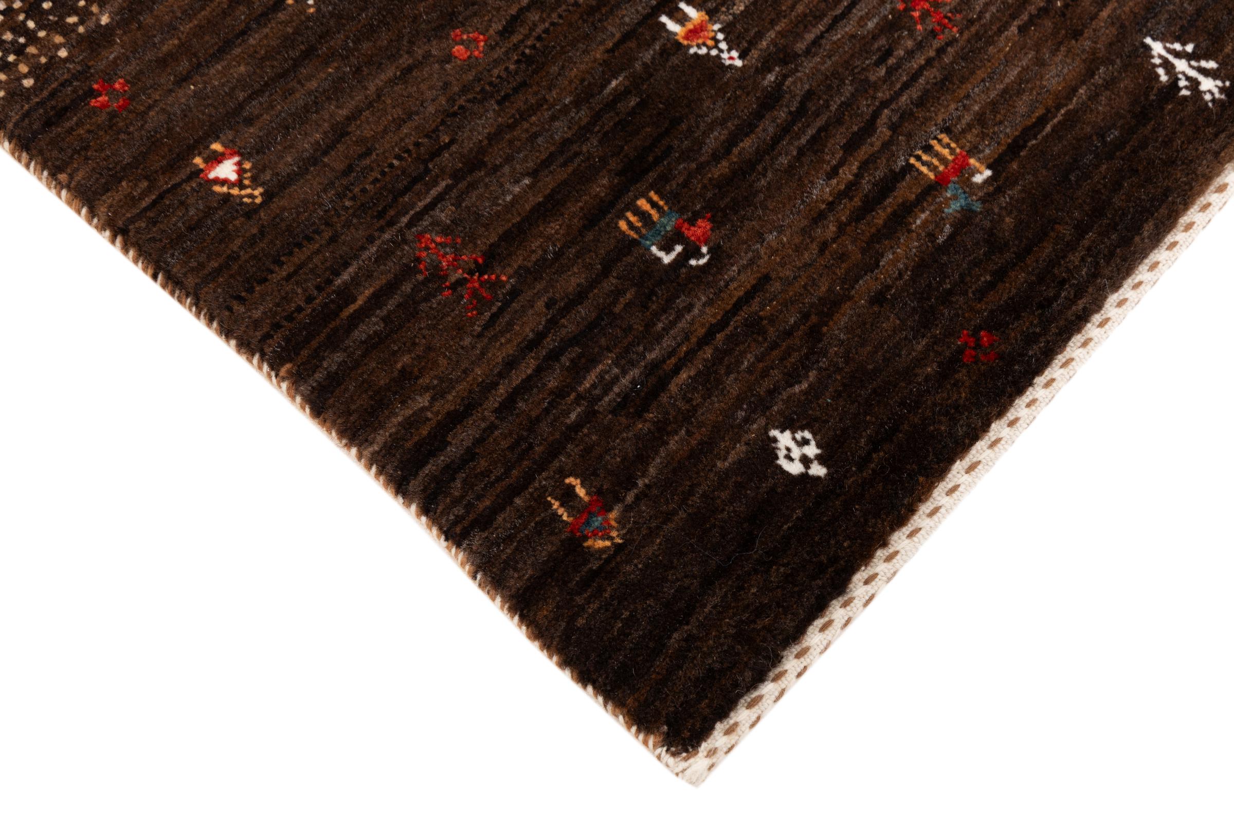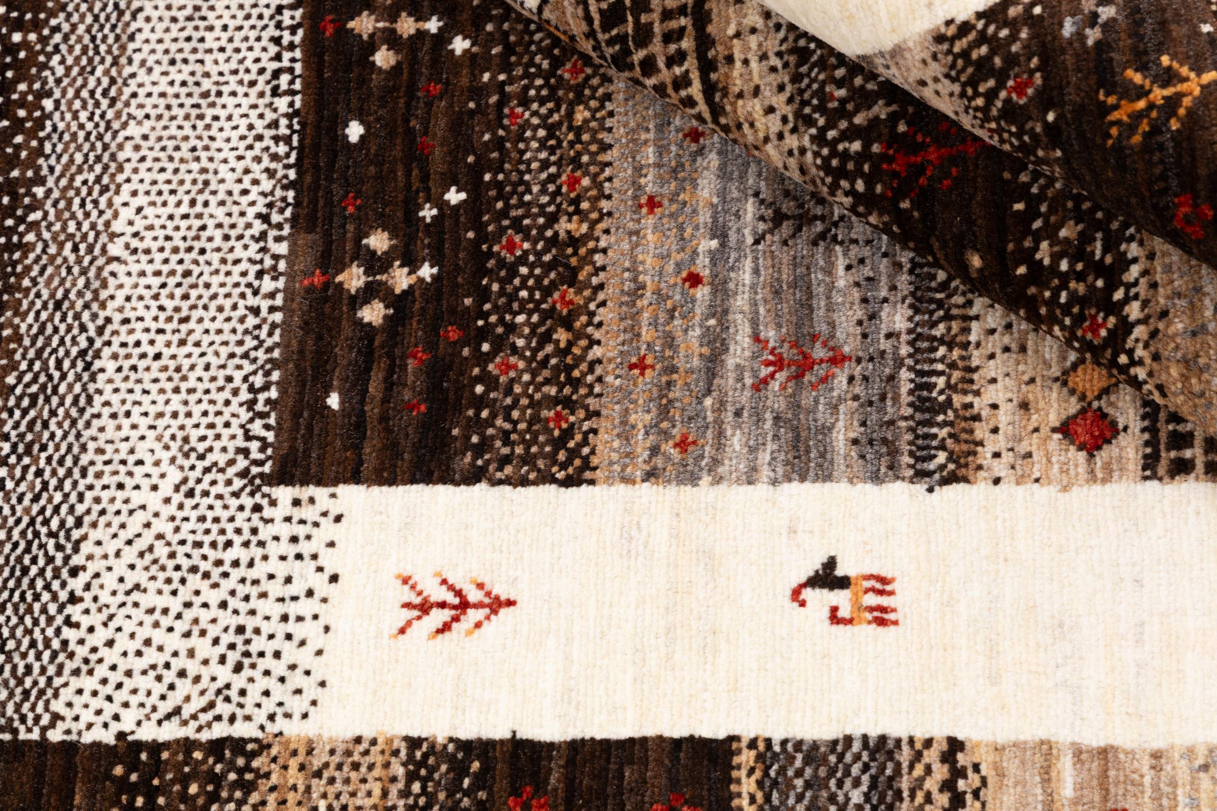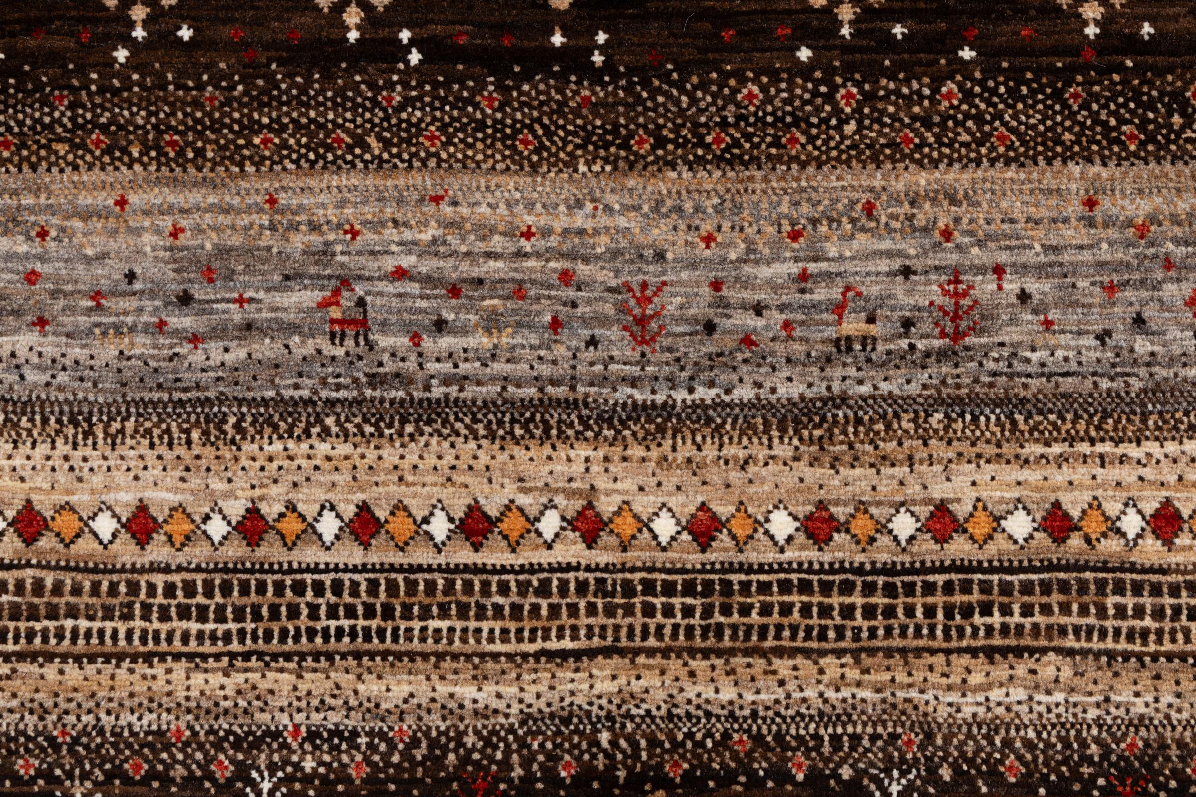 Ce magnifique tapis est un Gabbeh persan et fait donc partie des tapis Gabbeh de la plus haute qualité. Les tapis sont noués par des nomades ou des semi-nomades en Iran selon un savoir-faire traditionnel. Les motifs simples sont pour la plupart inspirés par l'environnement local des nomades. Par exemple, on peut trouver des chameaux, des arbres ou des buissons sur les tapis traditionnels. Les tapis de Gabbeh persan sont faits de laine provenant de troupeaux de moutons élevés localement. La laine est donc encore en grande partie filée à la main. Ainsi, chacun de ces tapis orientaux incarne un caractère unique de culture ancienne.