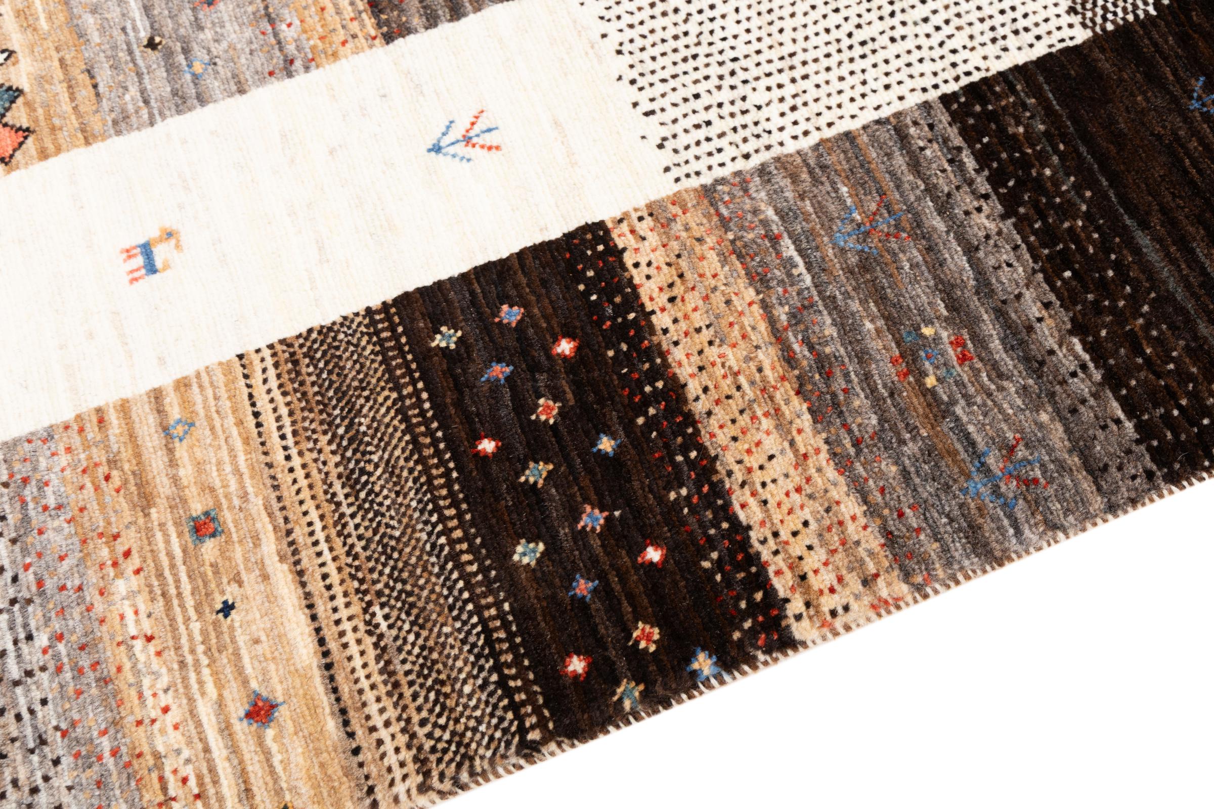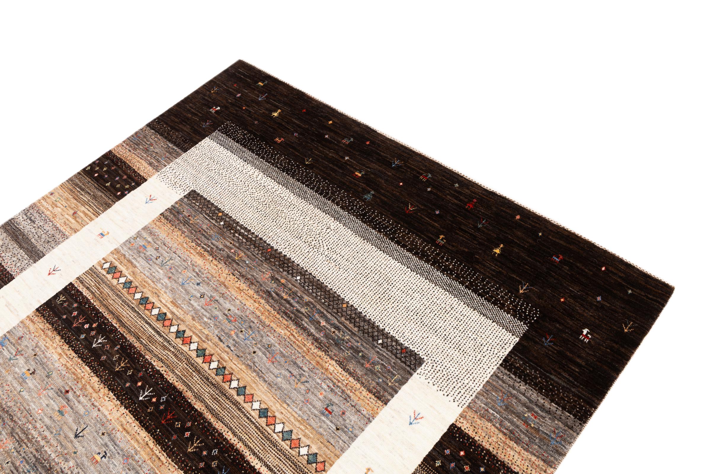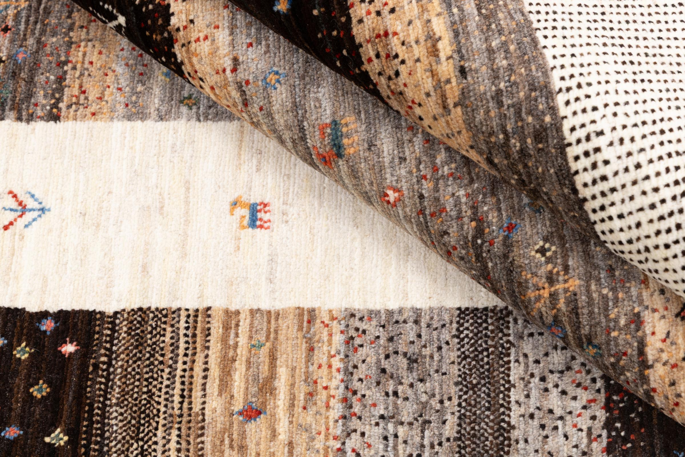 Ce magnifique tapis est un Gabbeh persan et fait donc partie des tapis Gabbeh de la plus haute qualité. Les tapis sont noués par des nomades ou des semi-nomades en Iran selon un savoir-faire traditionnel. Les motifs simples sont pour la plupart inspirés par l'environnement local des nomades. Par exemple, on peut trouver des chameaux, des arbres ou des buissons sur les tapis traditionnels. Les tapis de Gabbeh persan sont faits de laine provenant de troupeaux de moutons élevés localement. La laine est donc encore en grande partie filée à la main. Ainsi, chacun de ces tapis orientaux incarne un caractère unique de culture ancienne.