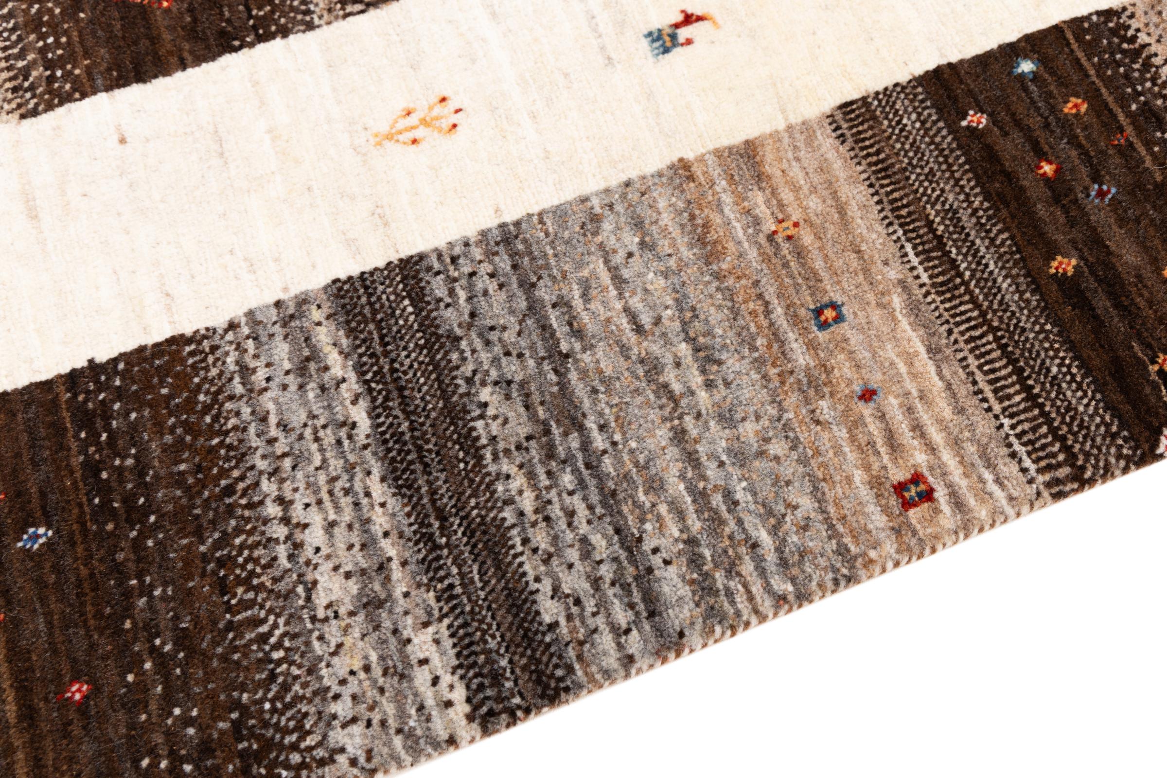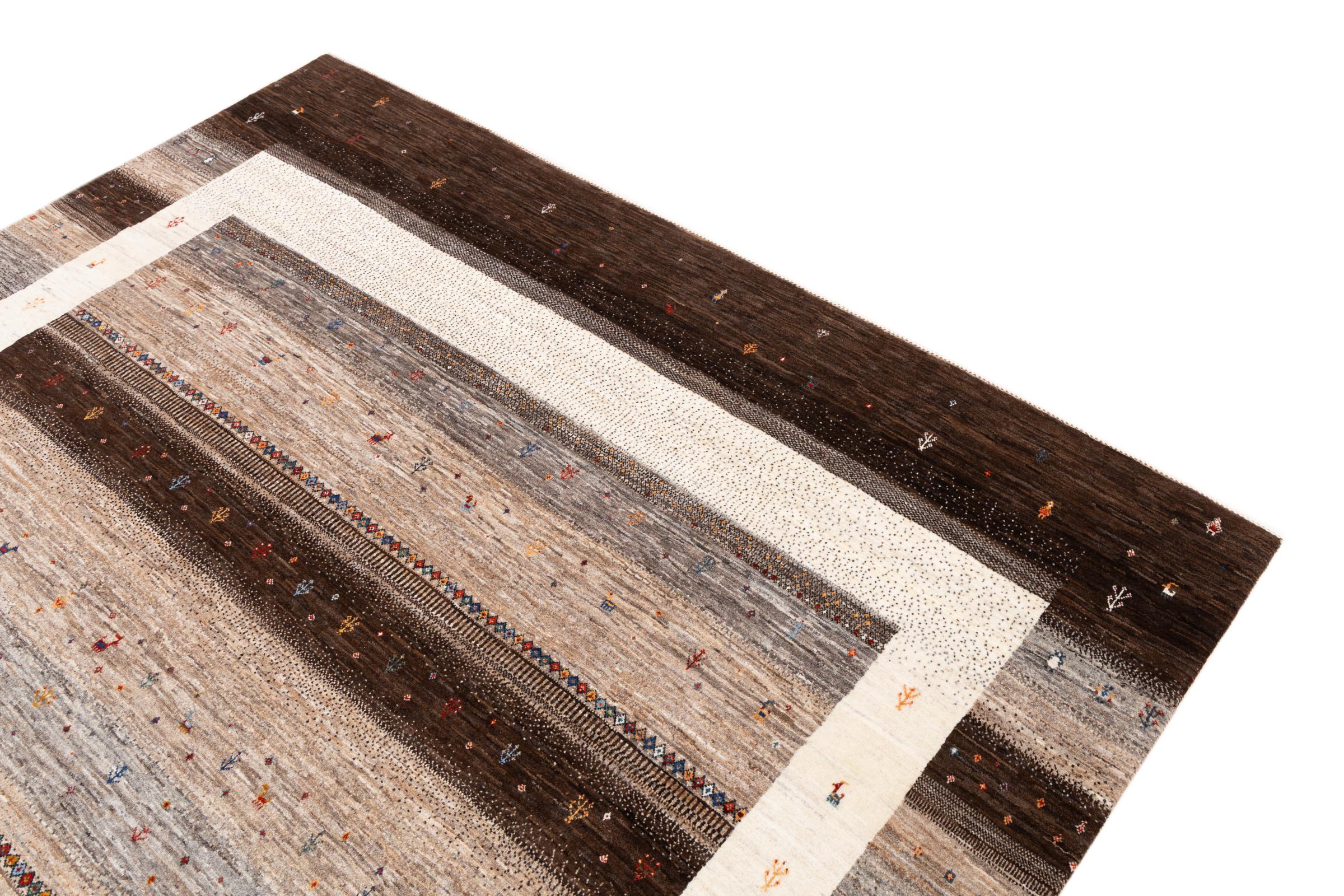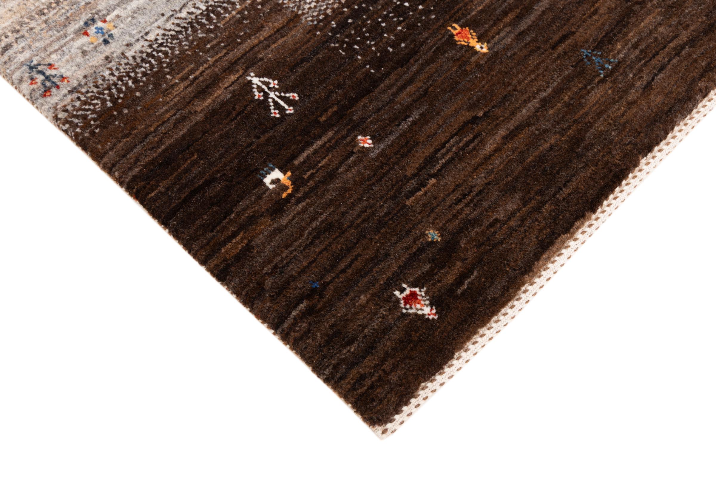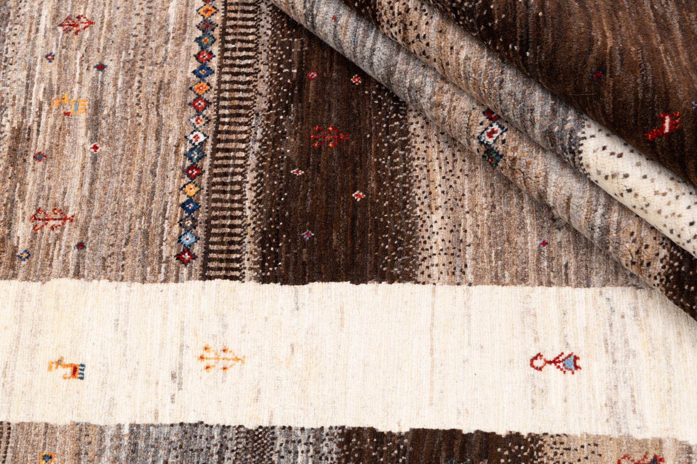 Ce magnifique tapis est un Gabbeh persan et fait donc partie des tapis Gabbeh de la plus haute qualité. Les tapis sont noués par des nomades ou des semi-nomades en Iran selon un savoir-faire traditionnel. Les motifs simples sont pour la plupart inspirés par l'environnement local des nomades. Par exemple, on peut trouver des chameaux, des arbres ou des buissons sur les tapis traditionnels. Les tapis de Gabbeh persan sont faits de laine provenant de troupeaux de moutons élevés localement. La laine est donc encore en grande partie filée à la main. Ainsi, chacun de ces tapis orientaux incarne un caractère unique de culture ancienne.
