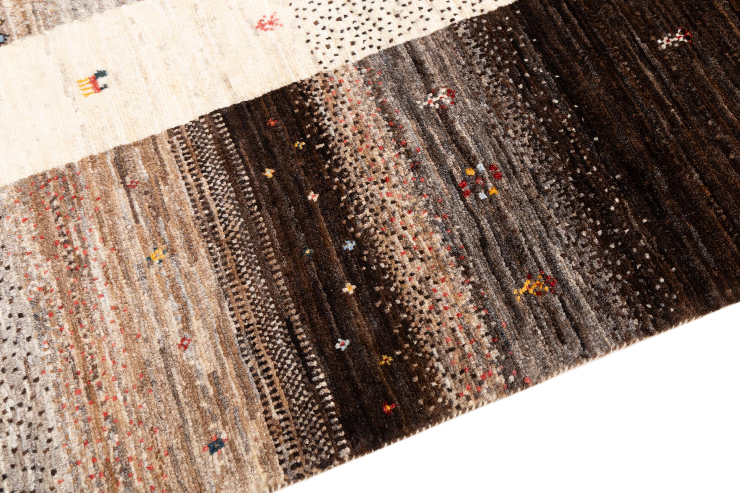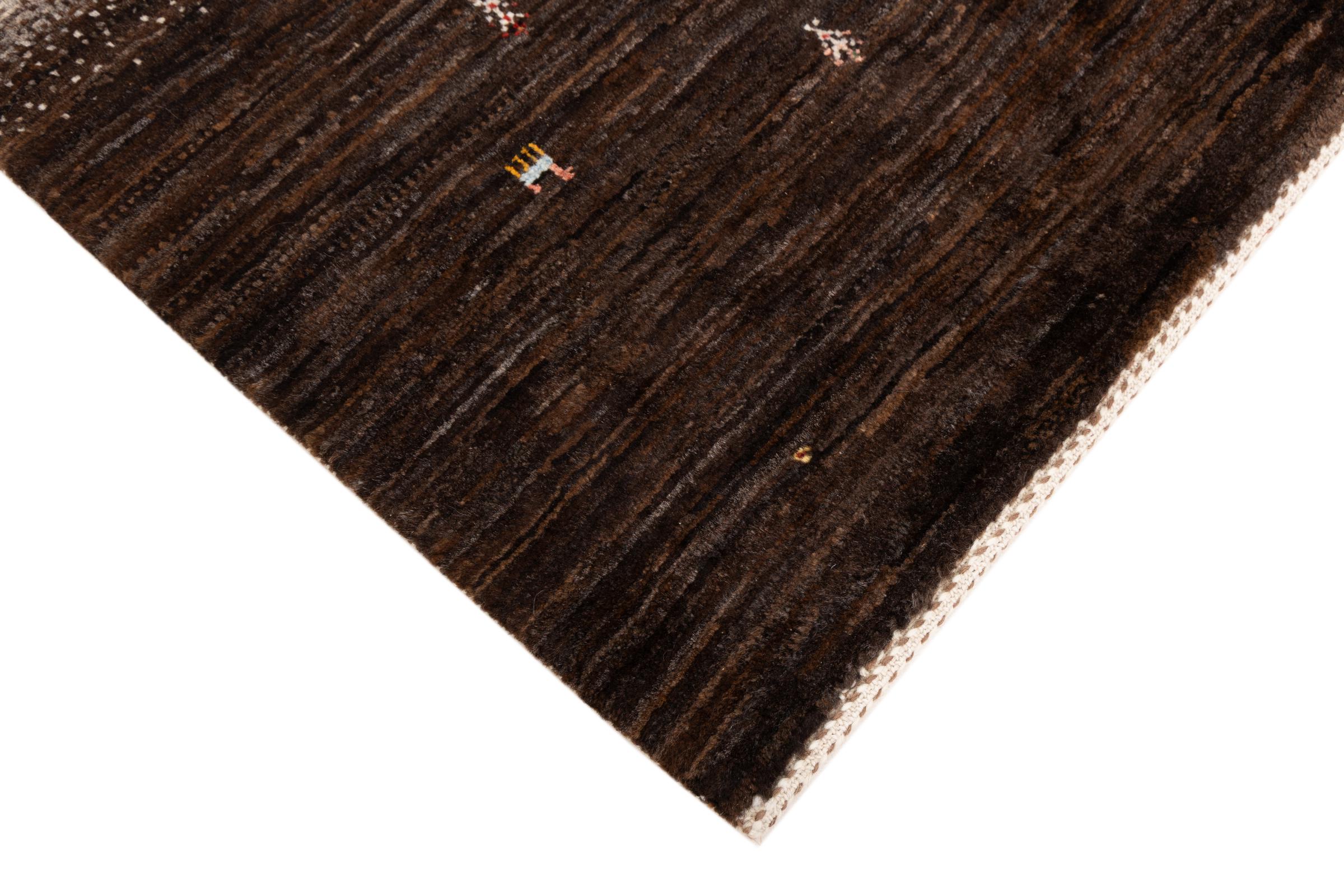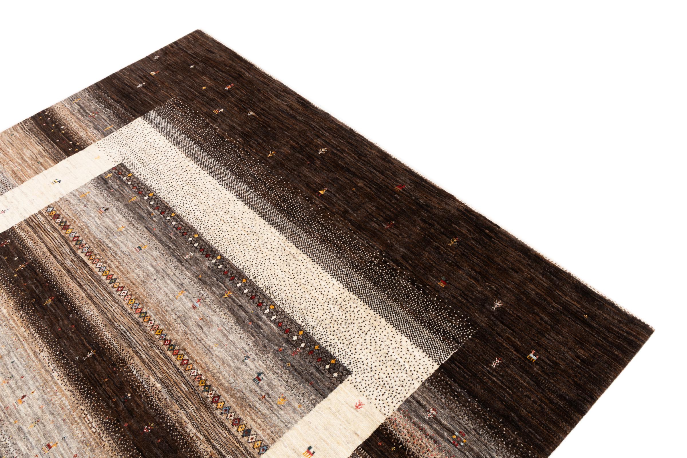 Ce magnifique tapis est un Gabbeh persan et fait donc partie des tapis Gabbeh de la plus haute qualité. Les tapis sont noués par des nomades ou des semi-nomades en Iran selon un savoir-faire traditionnel. Les motifs simples sont pour la plupart inspirés par l'environnement local des nomades. Par exemple, on peut trouver des chameaux, des arbres ou des buissons sur les tapis traditionnels. Les tapis de Gabbeh persan sont faits de laine provenant de troupeaux de moutons élevés localement. La laine est donc encore en grande partie filée à la main. Ainsi, chacun de ces tapis orientaux incarne un caractère unique de culture ancienne.