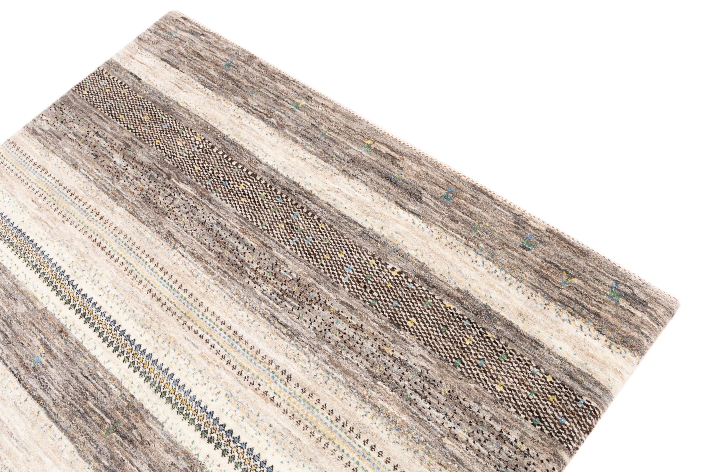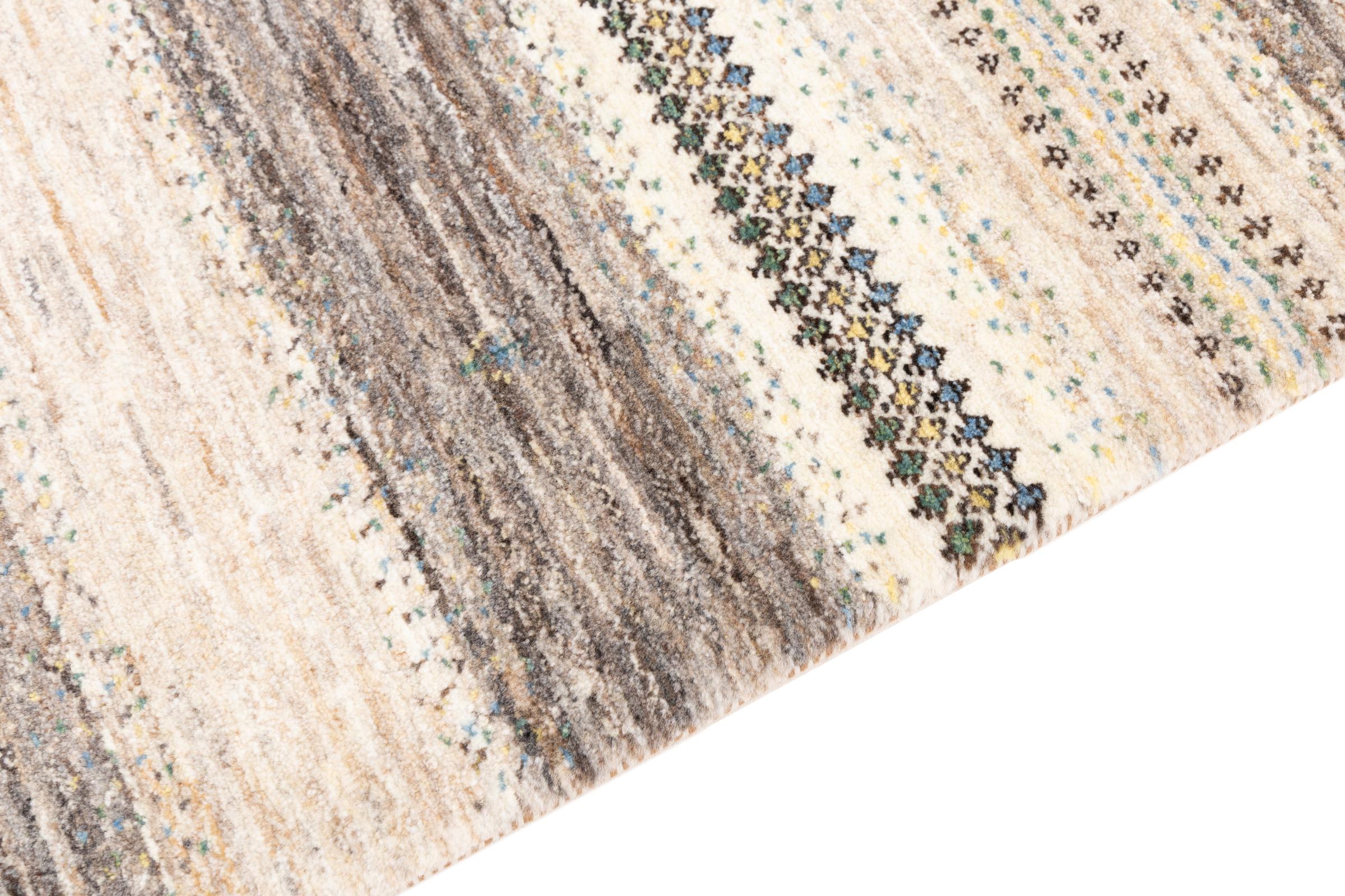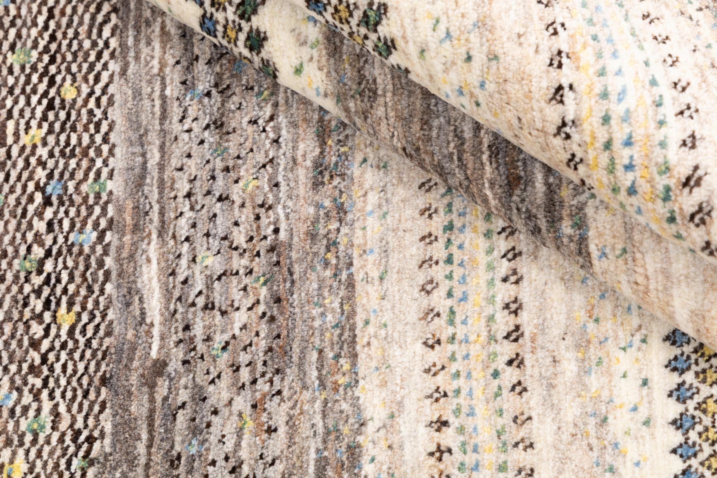 Ce magnifique tapis est un Gabbeh persan et fait donc partie des tapis Gabbeh de la plus haute qualité. Les tapis sont noués par des nomades ou des semi-nomades en Iran selon un savoir-faire traditionnel. Les motifs simples sont pour la plupart inspirés par l'environnement local des nomades. Par exemple, on peut trouver des chameaux, des arbres ou des buissons sur les tapis traditionnels. Les tapis de Gabbeh persan sont faits de laine provenant de troupeaux de moutons élevés localement. La laine est donc encore en grande partie filée à la main. Ainsi, chacun de ces tapis orientaux incarne un caractère unique de culture ancienne.
