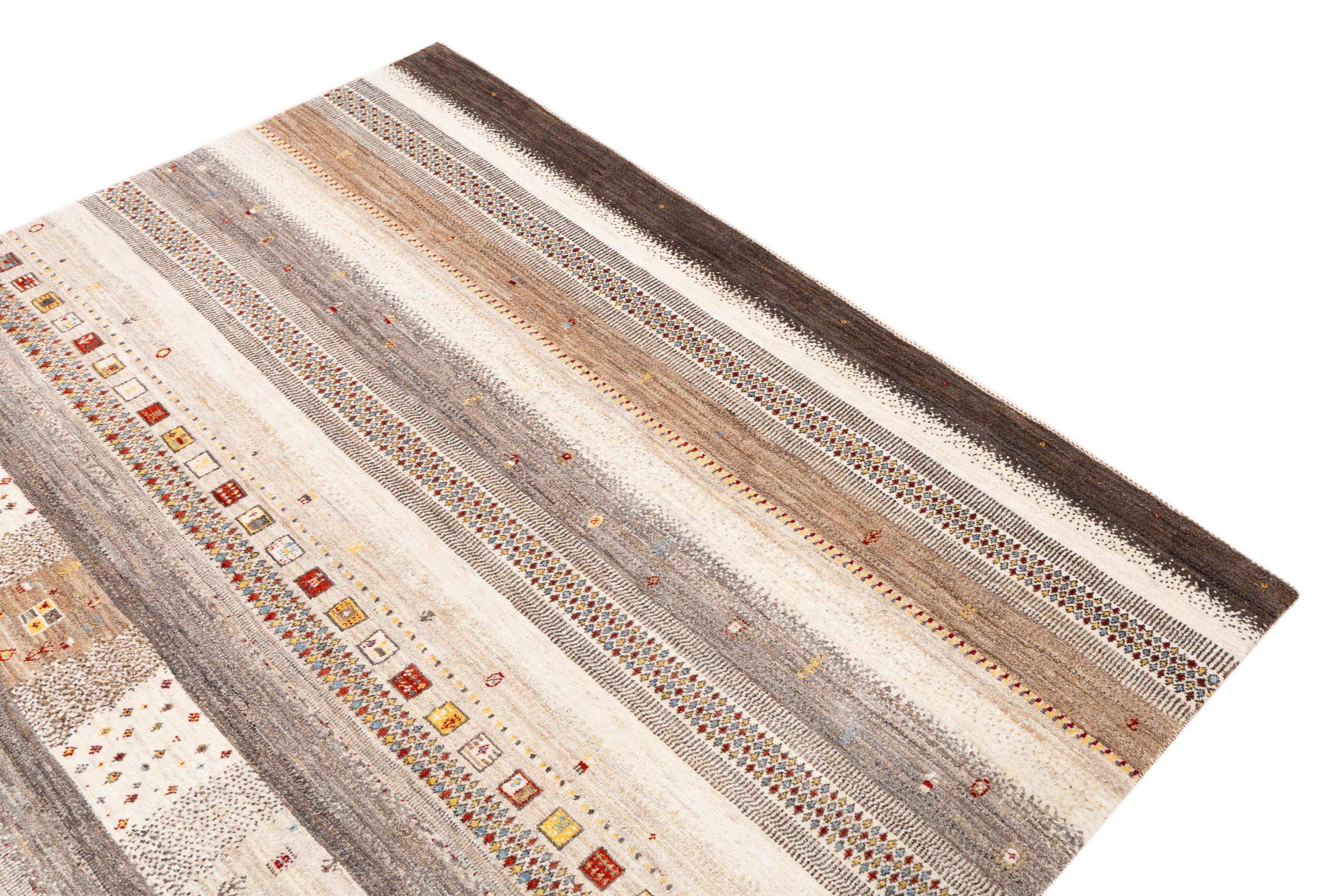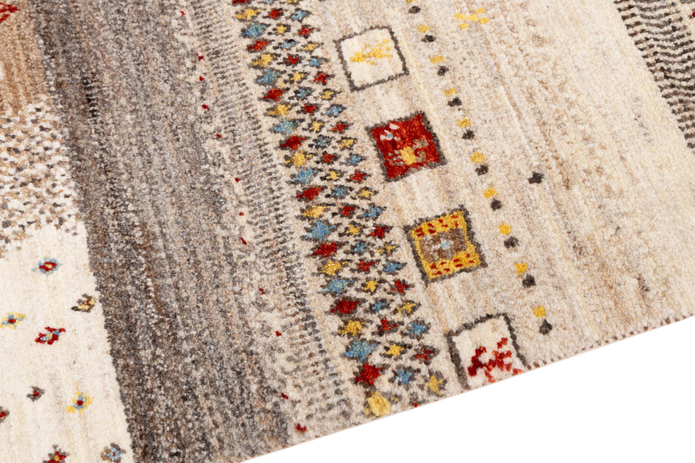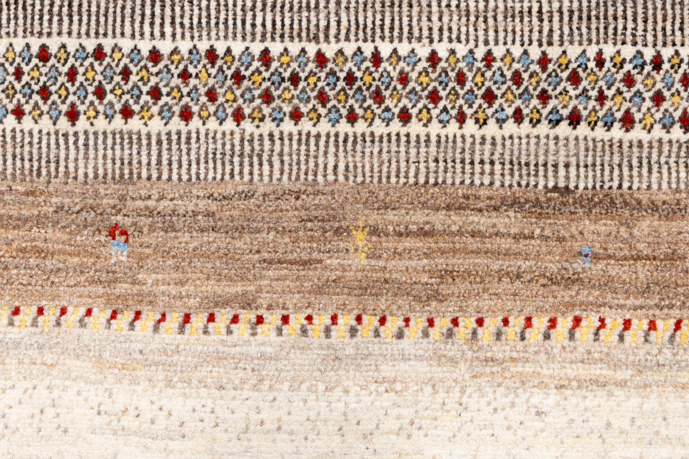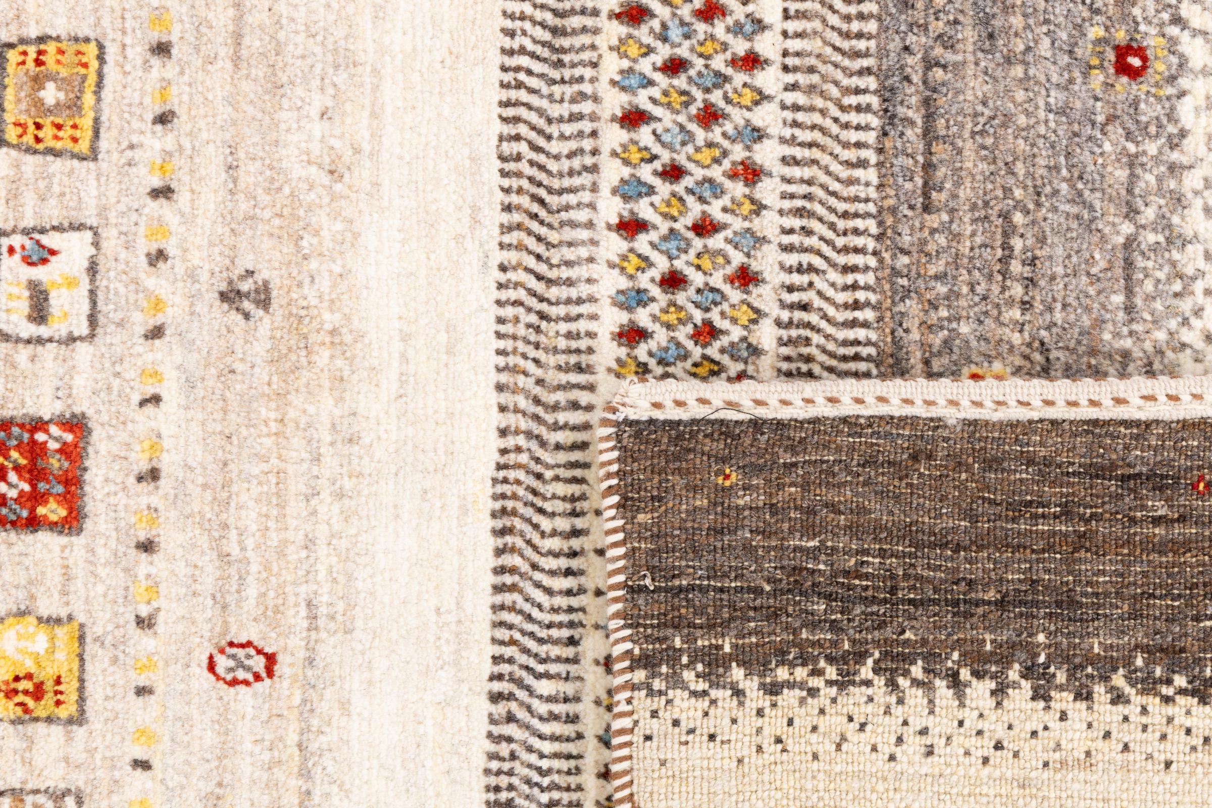 Ce magnifique tapis est un Gabbeh persan et fait donc partie des tapis Gabbeh de la plus haute qualité. Les tapis sont noués par des nomades ou des semi-nomades en Iran selon un savoir-faire traditionnel. Les motifs simples sont pour la plupart inspirés par l'environnement local des nomades. Par exemple, on peut trouver des chameaux, des arbres ou des buissons sur les tapis traditionnels. Les tapis de Gabbeh persan sont faits de laine provenant de troupeaux de moutons élevés localement. La laine est donc encore en grande partie filée à la main. Ainsi, chacun de ces tapis orientaux incarne un caractère unique de culture ancienne.