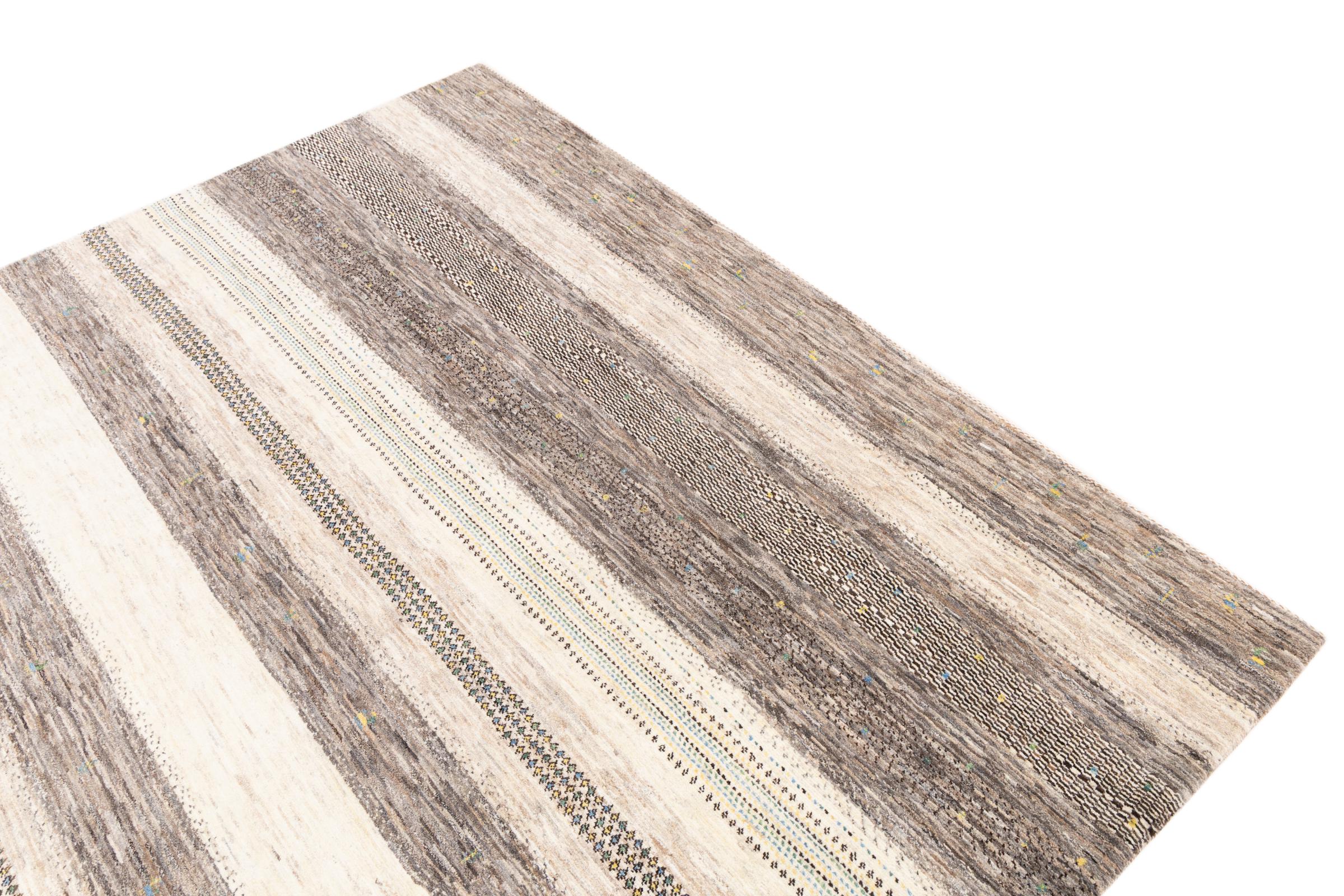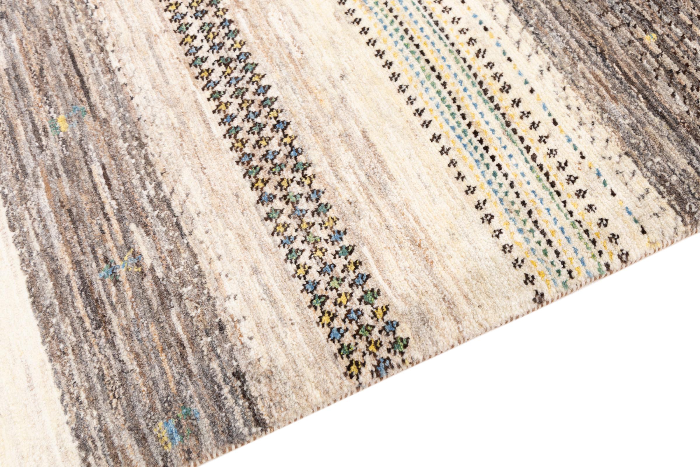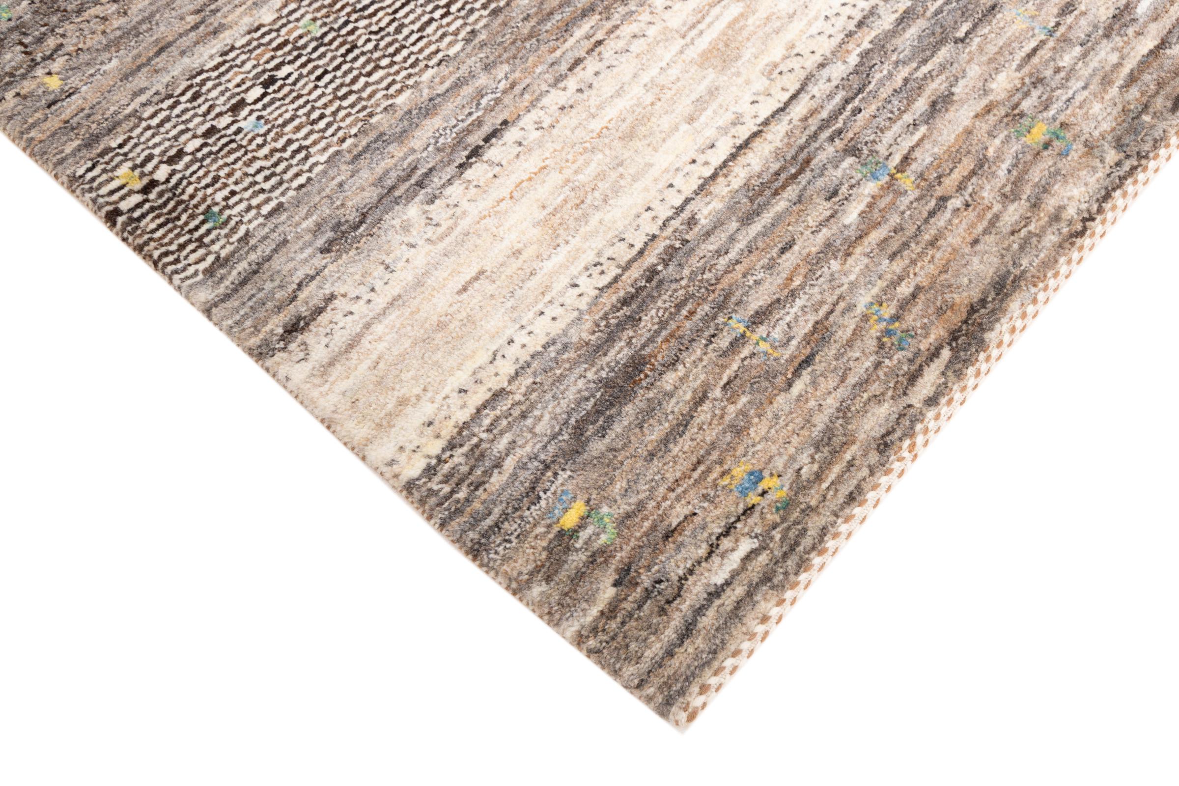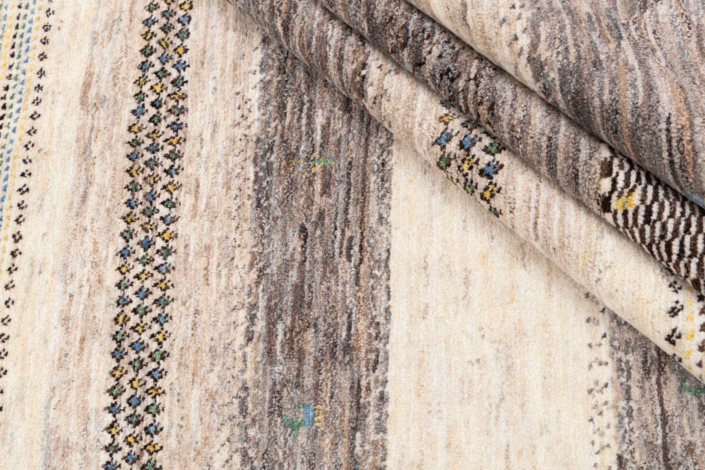 Ce magnifique tapis est un Gabbeh persan et fait donc partie des tapis Gabbeh de la plus haute qualité. Les tapis sont noués par des nomades ou des semi-nomades en Iran selon un savoir-faire traditionnel. Les motifs simples sont pour la plupart inspirés par l'environnement local des nomades. Par exemple, on peut trouver des chameaux, des arbres ou des buissons sur les tapis traditionnels. Les tapis de Gabbeh persan sont faits de laine provenant de troupeaux de moutons élevés localement. La laine est donc encore en grande partie filée à la main. Ainsi, chacun de ces tapis orientaux incarne un caractère unique de culture ancienne.
