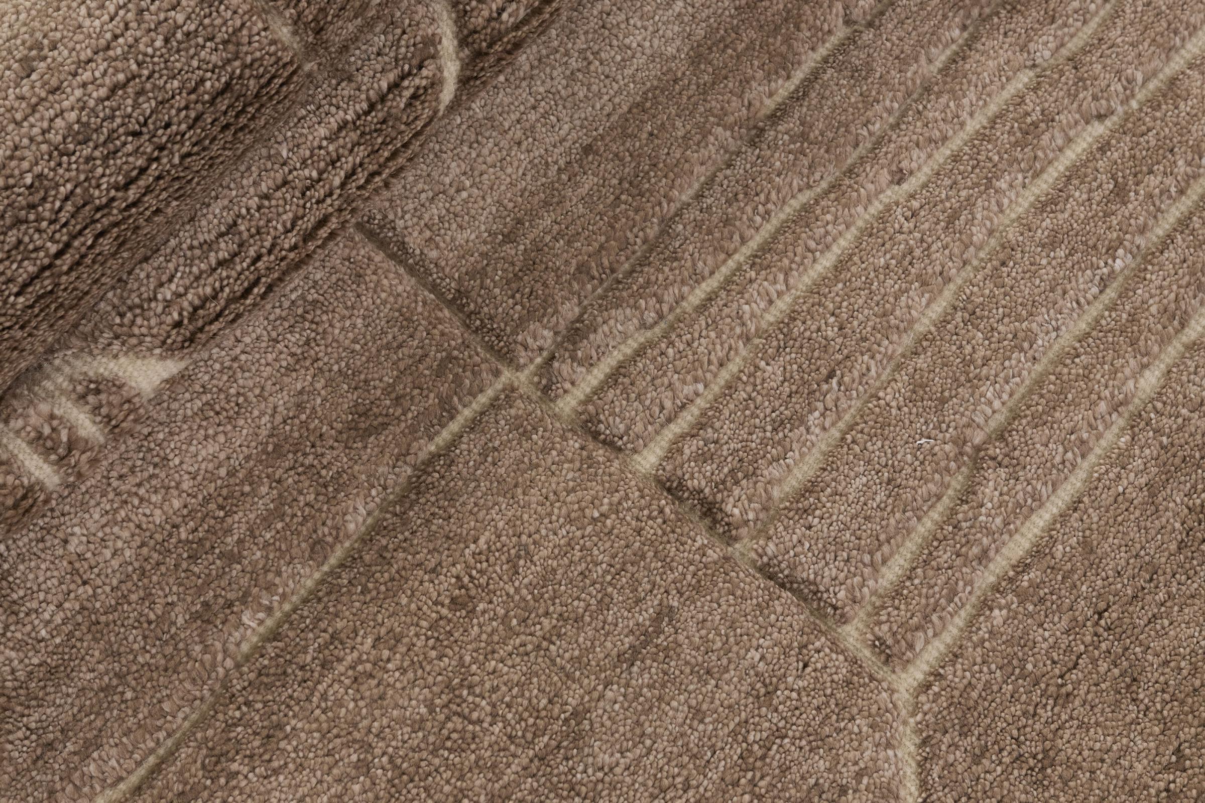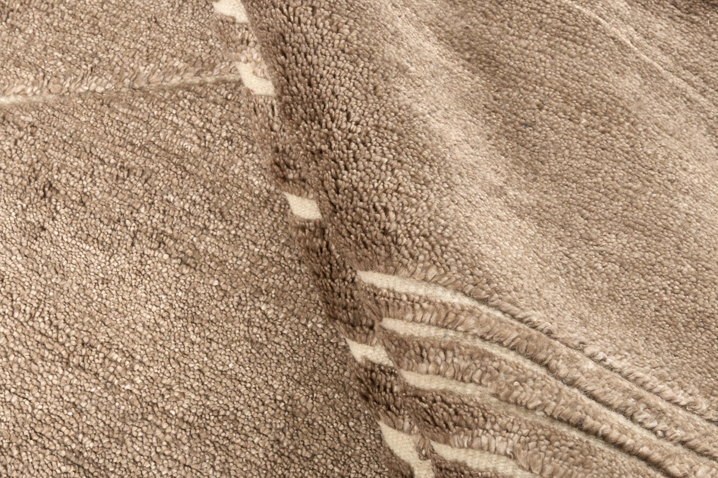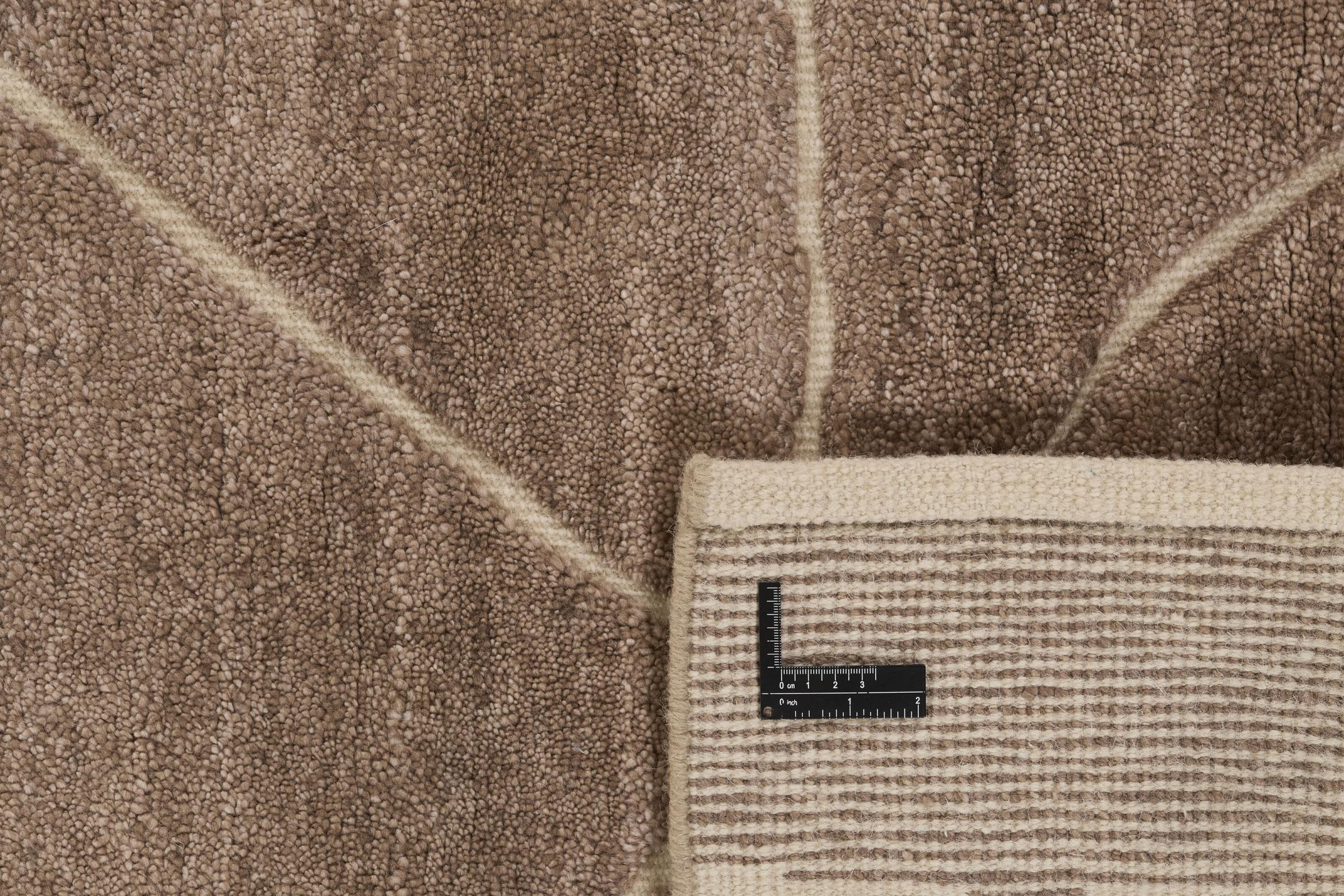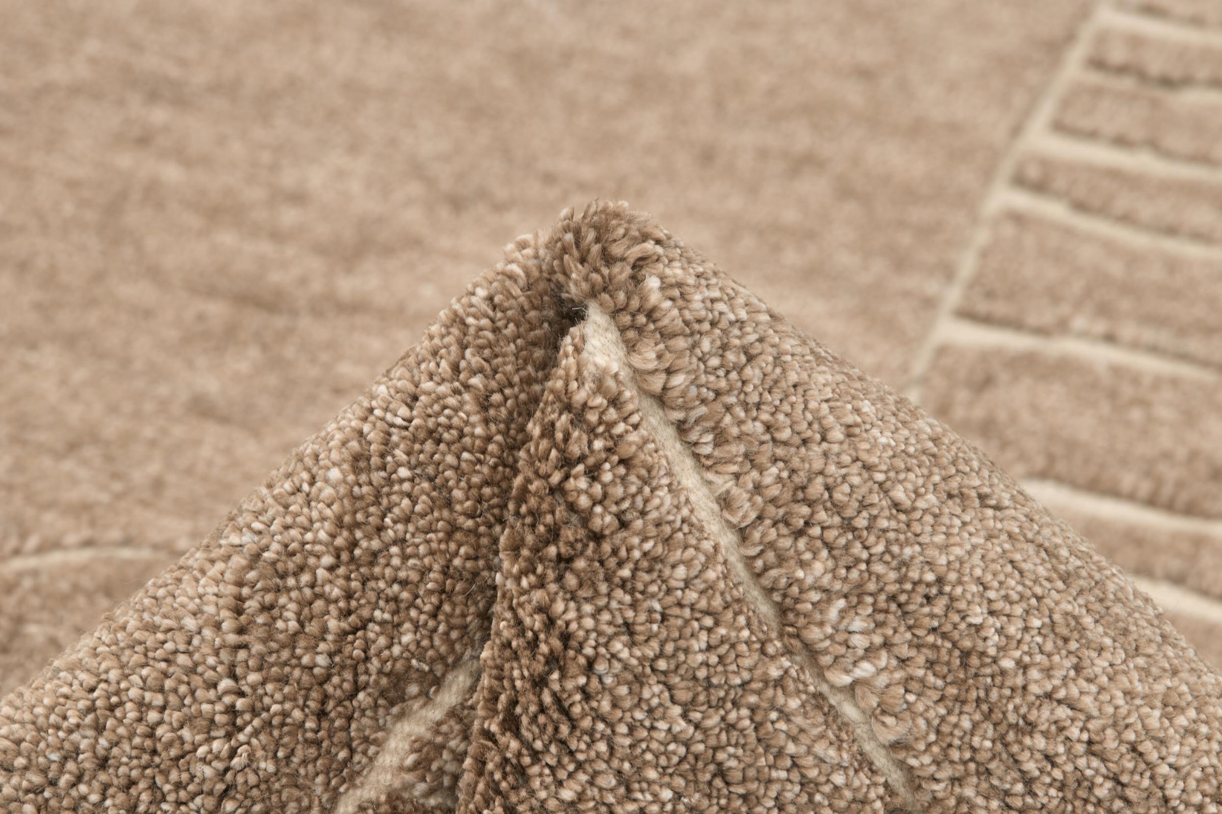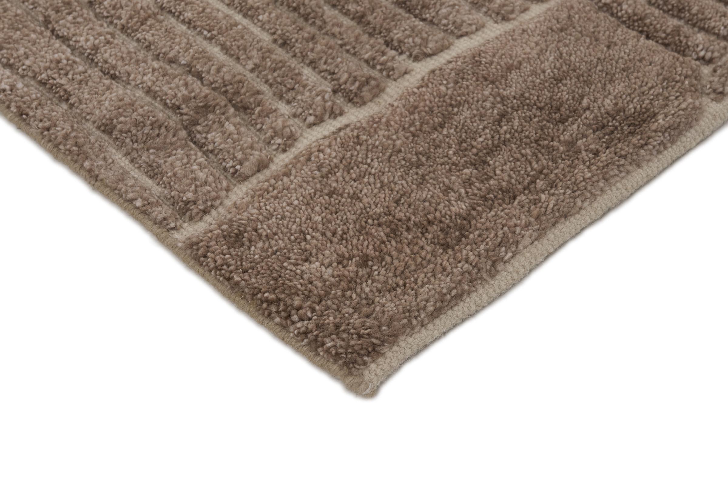 Des motifs simples et modernes et des couleurs désaturées sont typiques de ce type de tapis indien. Il a été noué à la main en laine de mouton et en viscose. Il a une grande brillance et est plus doux que les tapis en laine classiques.