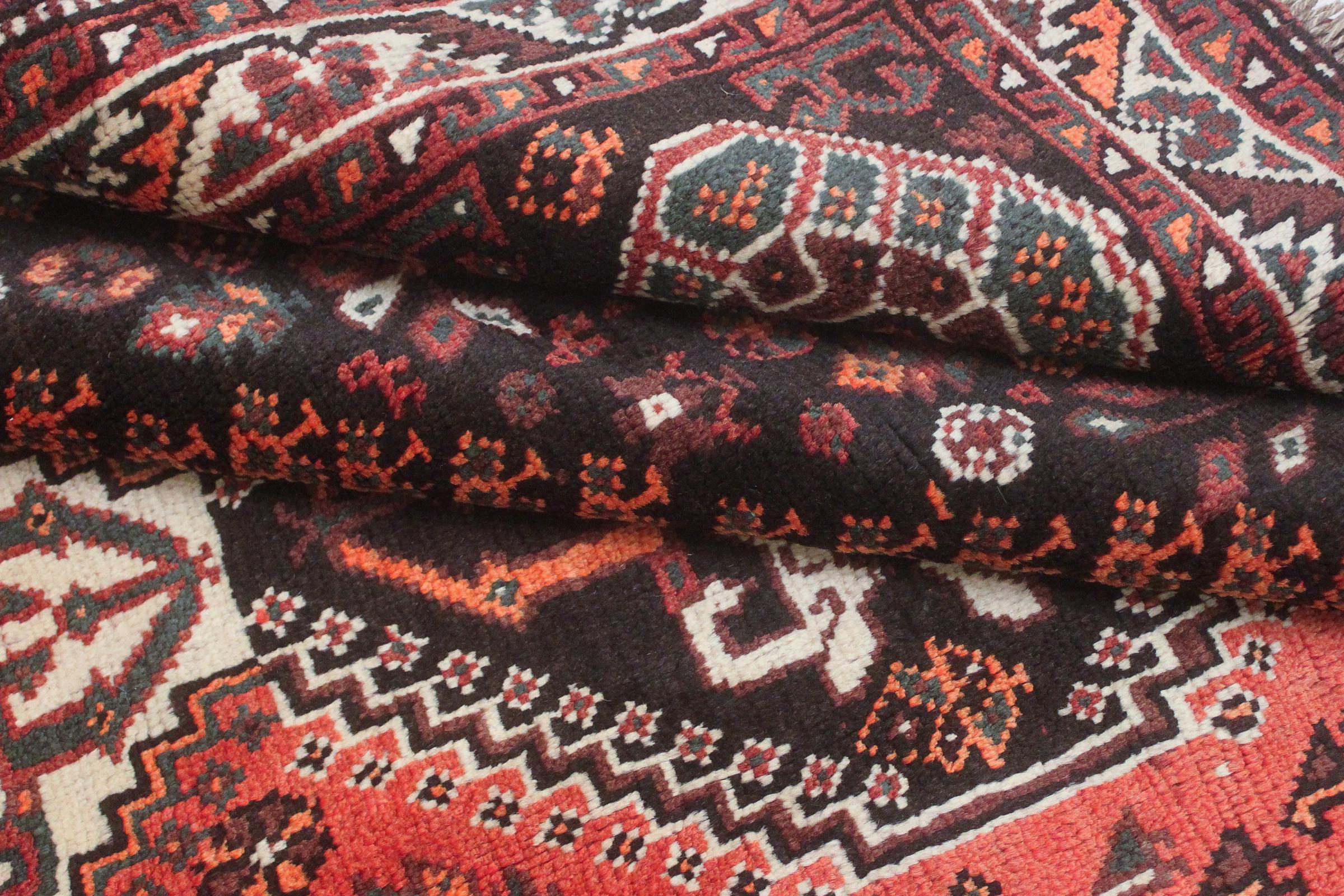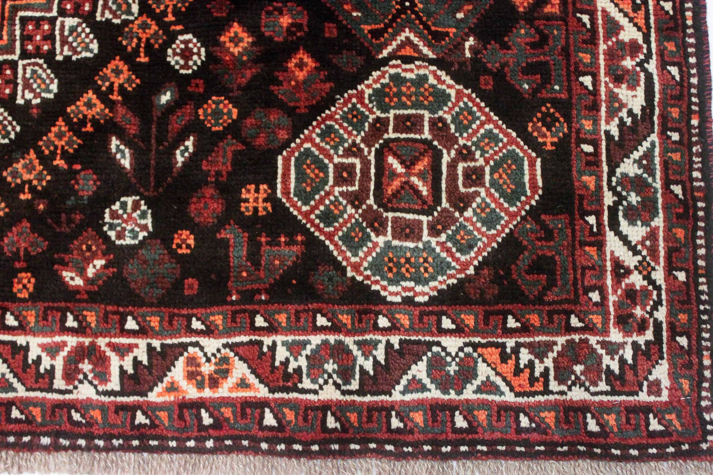 Ce tapis appartient aux tapis de village et de nomade d'Iran, anciennement la Perse. Ce type de tapis est noué à la main dans les petites villes et les villages selon l'ancienne tradition. Même les nomades nouent encore des tapis persans en plein air. Les tapis sont noués sans schéma et entièrement à partir de la tête. Ils se caractérisent par des ornements classiques, qui sont disposés en motifs droits et géométriques. Grâce à leur origine culturelle et traditionnelle, ces tapis ont un caractère unique qui incarne la Perse ancienne.