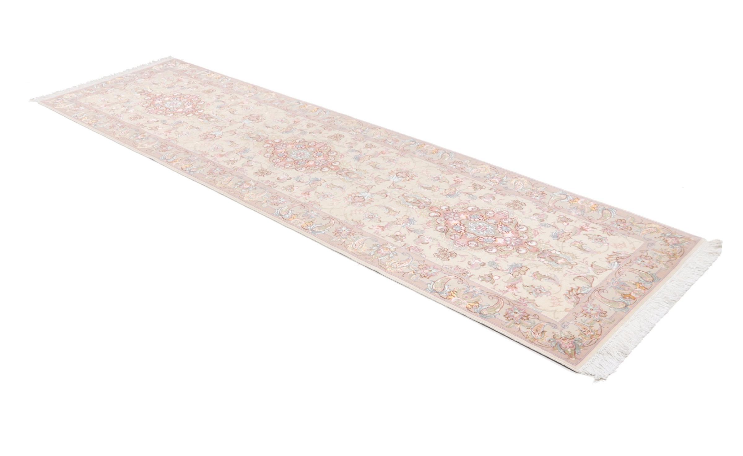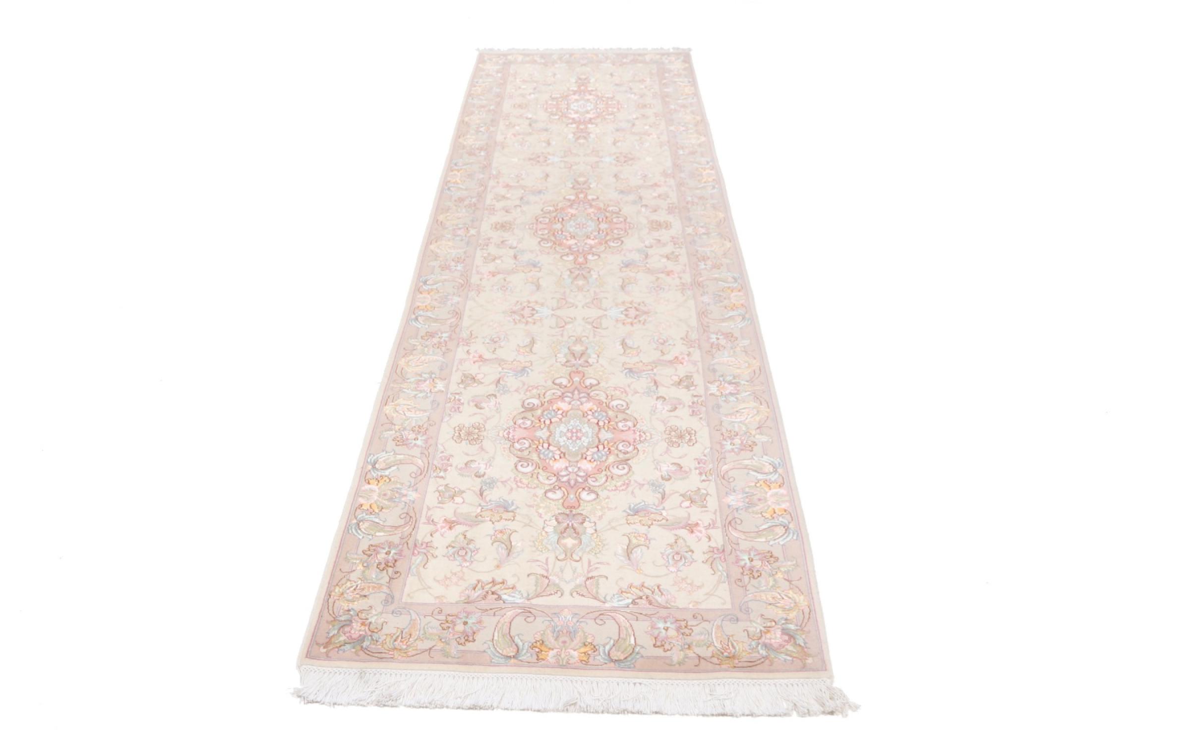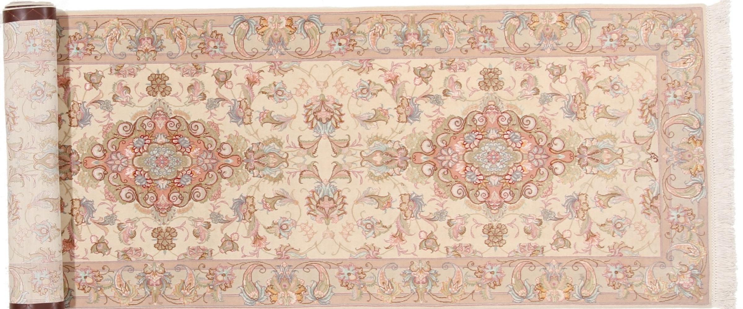 Réf. Article: 39730052436 Taille: 340x95 cm Épaisseur: ap. 7 mm Densité de nouage: 450 000 - 500 000 / m² Fabrication: Noué à la main Velours: Laine avec de la soie Chaîne: Coton Origine: Persie / Iran Âge: Nouveau Poids: ap. 10 kg Également connu sous Tabriz, Tabris, Täbris, Tebriz, Tebris, 40Raj, 50Raj Nombre en stock: Unique - Seulement 1 en stock
