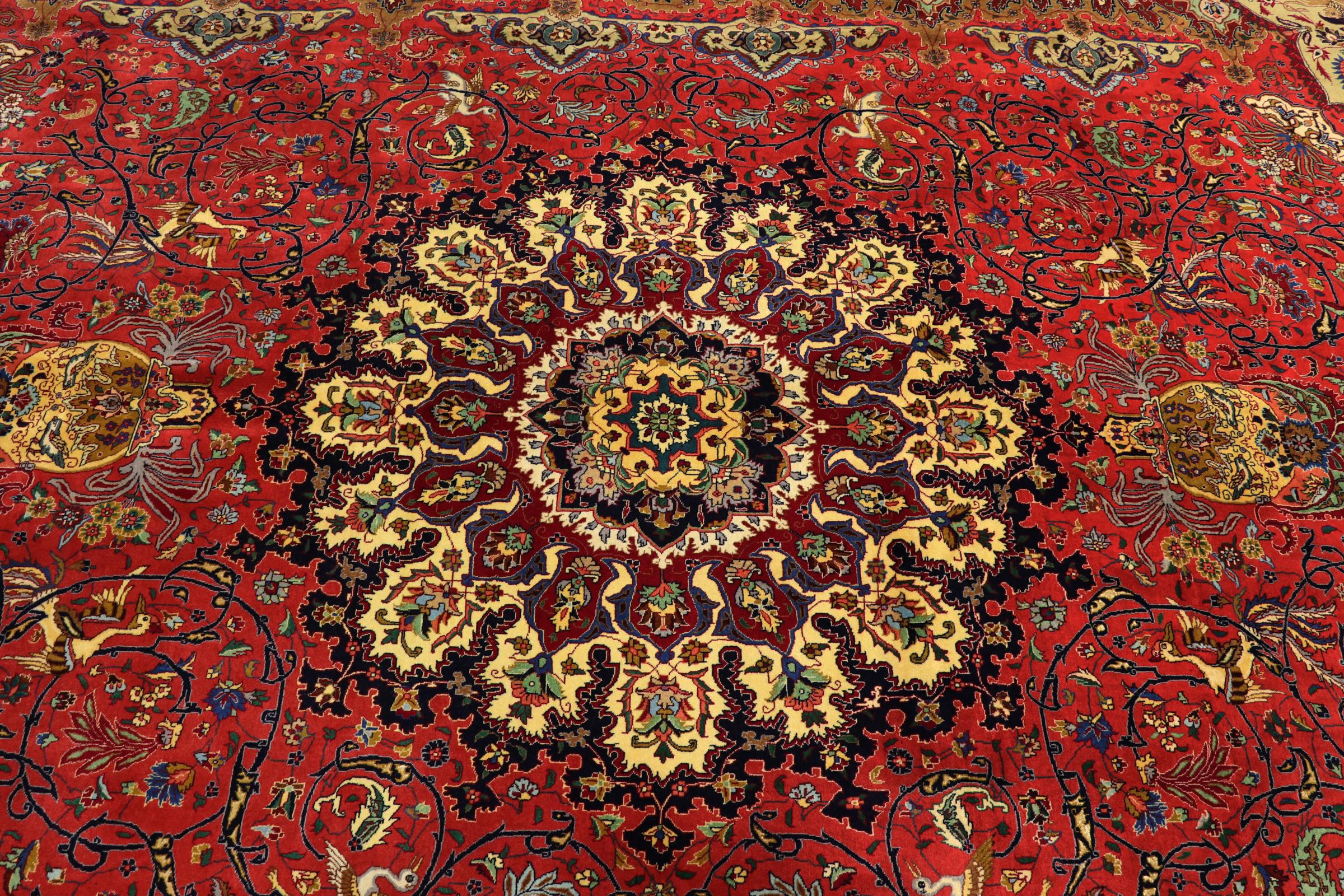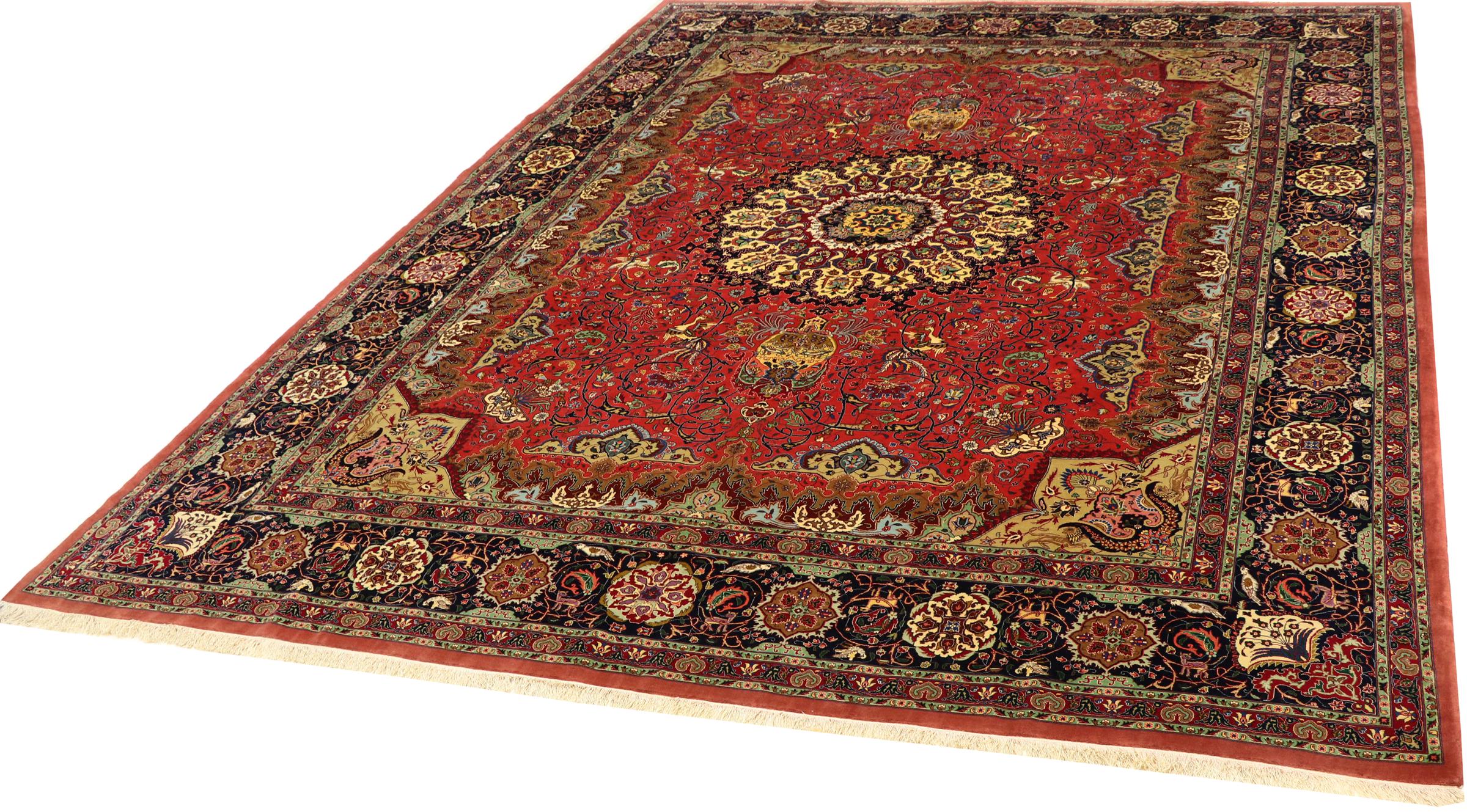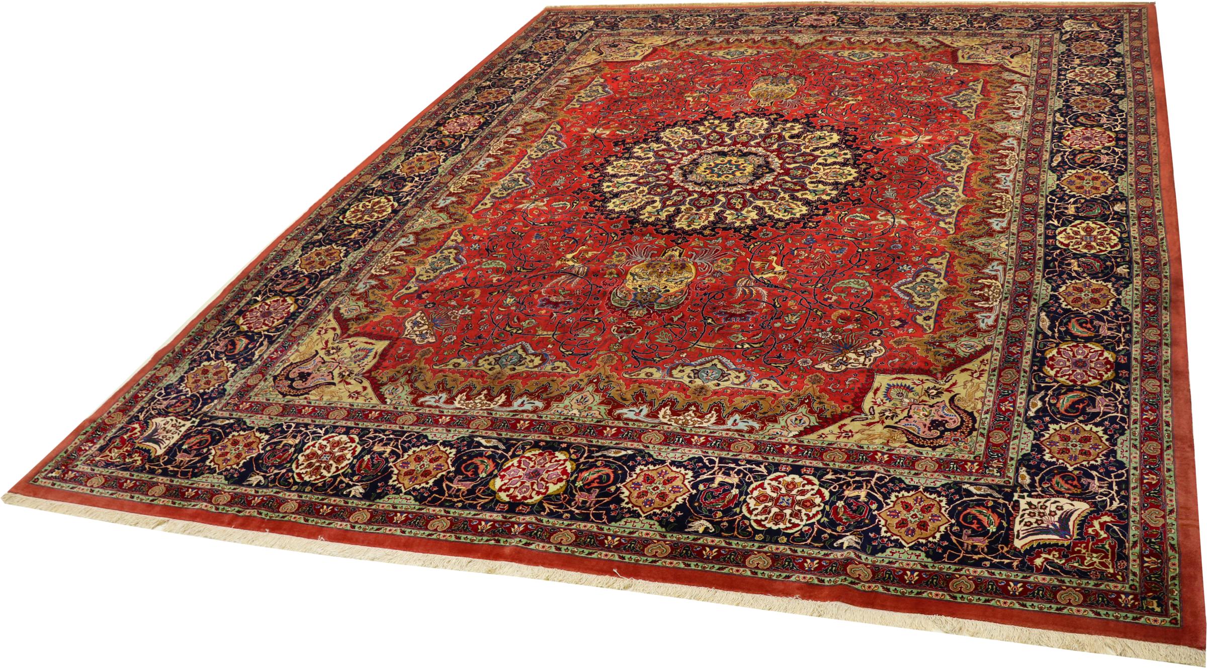 Réf. Article: 304092009039579 Taille: 391x294 cm Épaisseur: ap. 5 mm Densité de nouage: 440 000 - 490 000 / m² Fabrication: Noué à la main Velours: Laine de liège avec soie Chaîne: Coton Origine: Persie / Iran Âge: Nouveau Poids: ap. 40 kg Également connu sous Tabriz, Tabris, Täbris, Tebriz, Tebris, 40Raj, 50Raj Nombre en stock: Unique - Seulement 1 en stock
