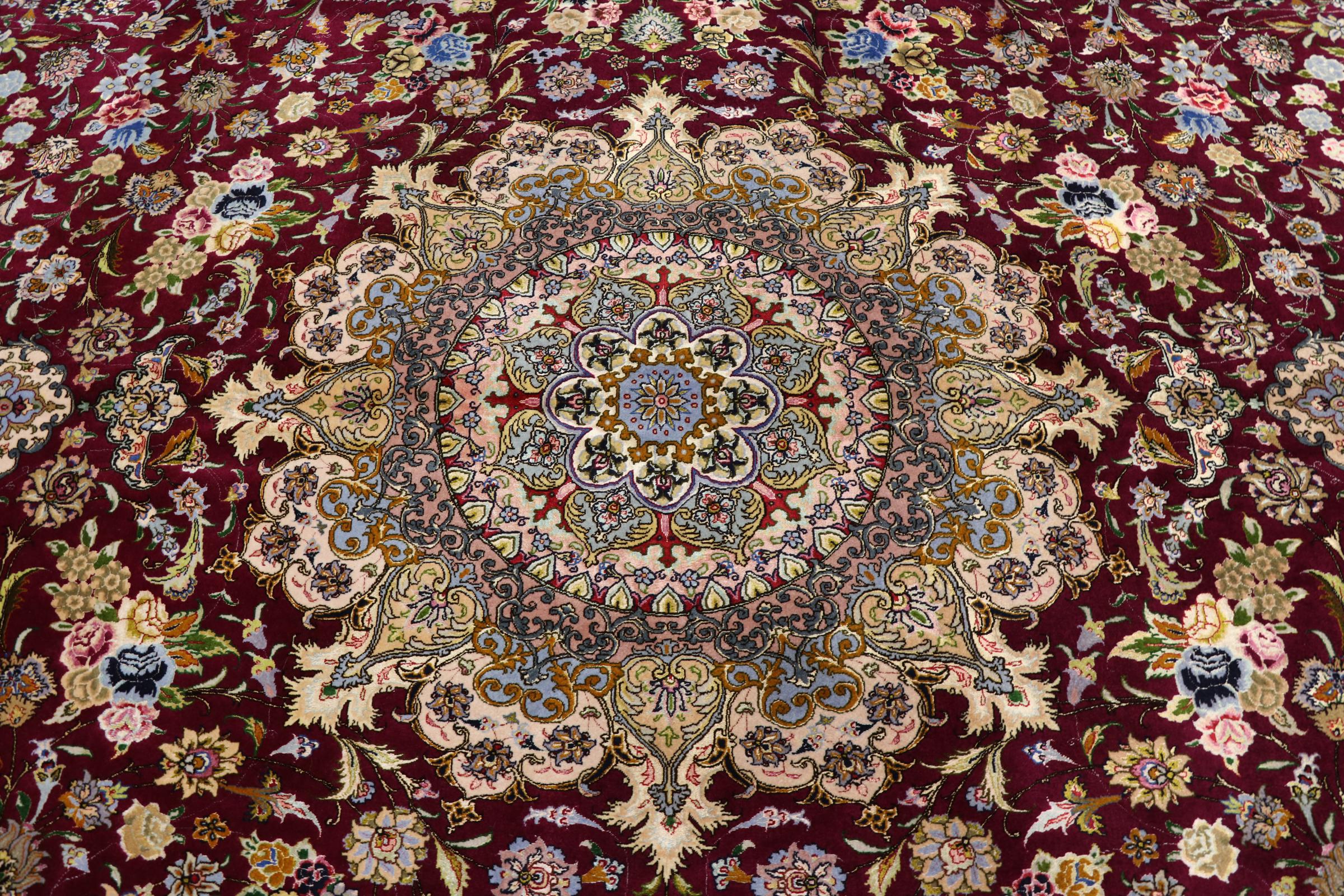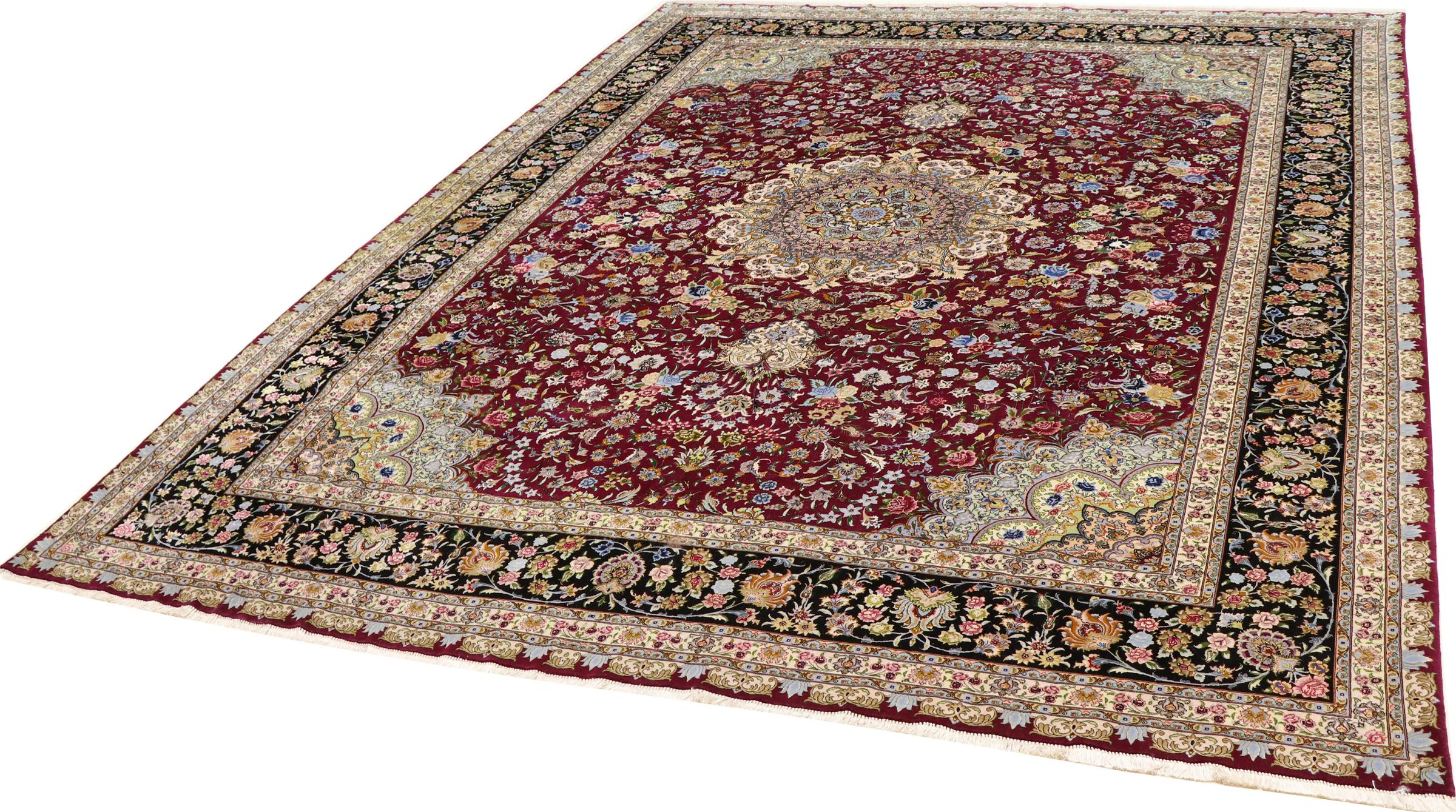 Tabriz est l'une des plus grandes villes d'Iran et l'une des plus célèbres provinces de tapis persans. Les tapis de Tabriz sont souvent indiqués par un numéro "Raj". Plus ce chiffre est élevé, plus le tapis est fin, car il indique la densité des nœuds. Il existe des tapis persans de Tabriz de classe moyenne (40 Raj) et de classe exceptionnellement fine (80 Raj).
