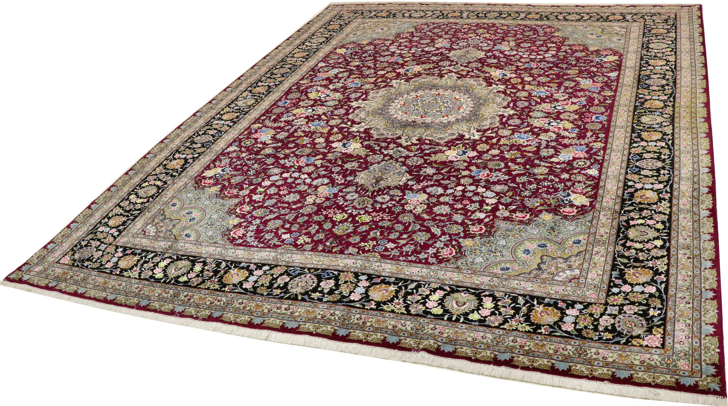 Réf. Article: 304090005579793 Taille: 399x299 cm Épaisseur: ap. 5 mm Densité de nouage: 440 000 - 490 000 / m² Fabrication: Noué à la main Velours: Laine de liège avec soie Chaîne: Coton Origine: Persie / Iran Âge: Nouveau Poids: ap. 42 kg Également connu sous Tabriz, Tabris, Täbris, Tebriz, Tebris, 40Raj, 50Raj Nombre en stock: Unique - Seulement 1 en stock