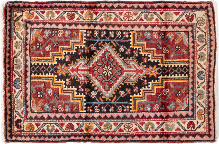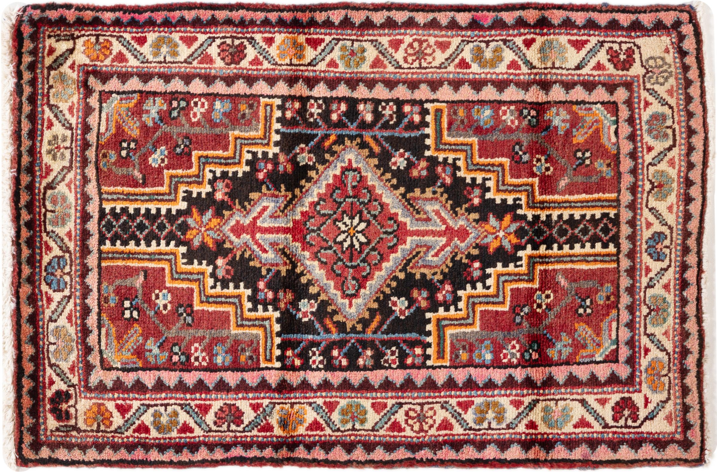 Réf. Article: 295586007154 Taille: 88x58 cm Épaisseur: ap. 10 mm Densité de nouage: 200 000 - 250 000 / m² Fabrication: Noué à la main Velours: Laine filée à la main Chaîne: Coton Origine: Persie / Iran Âge: Vieux/Semi antique, over 50 ans Poids: ap. 2 kg Nombre en stock: Unique - Seulement 1 en stock