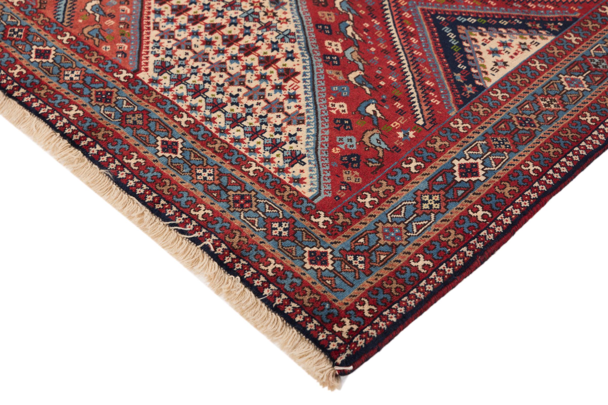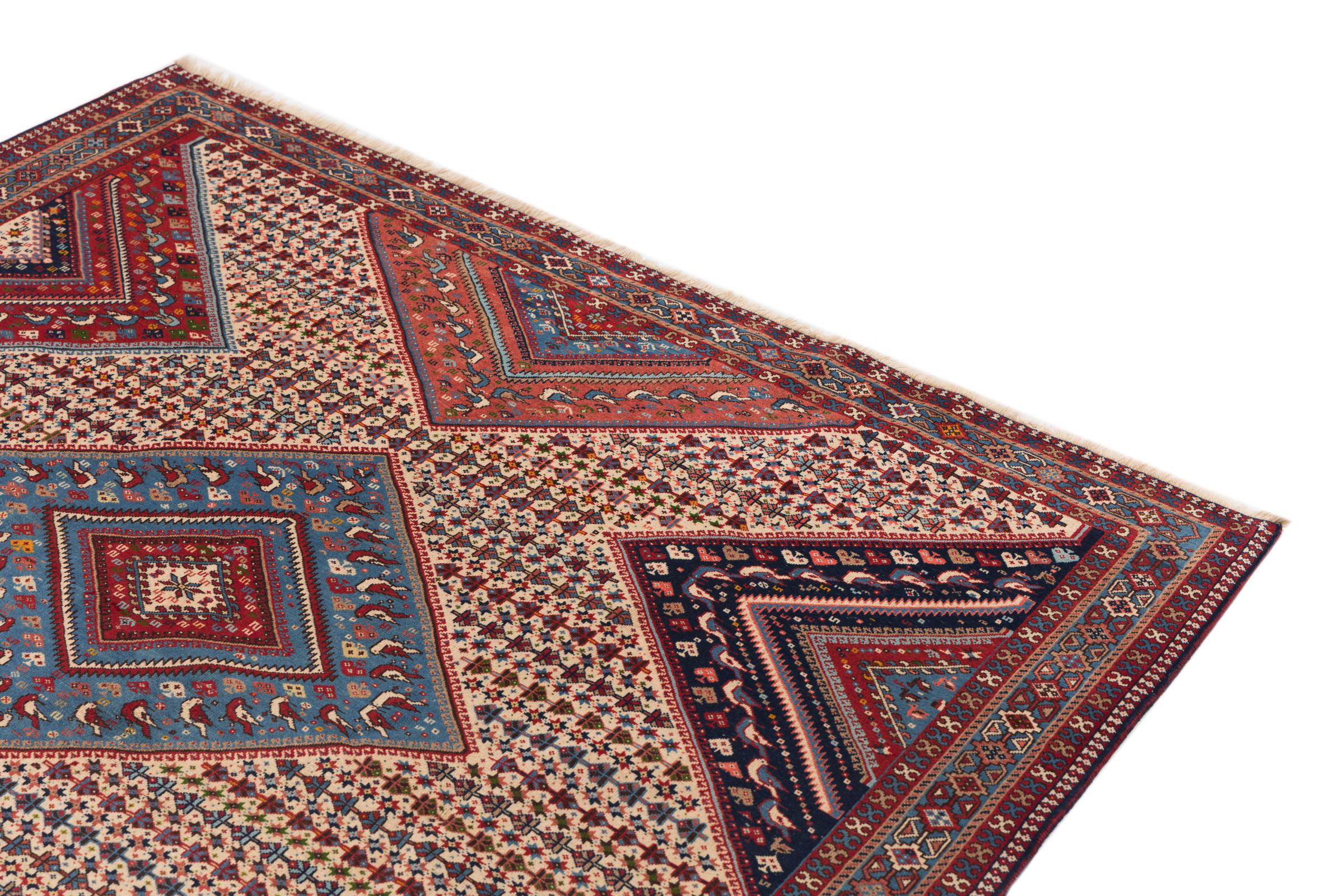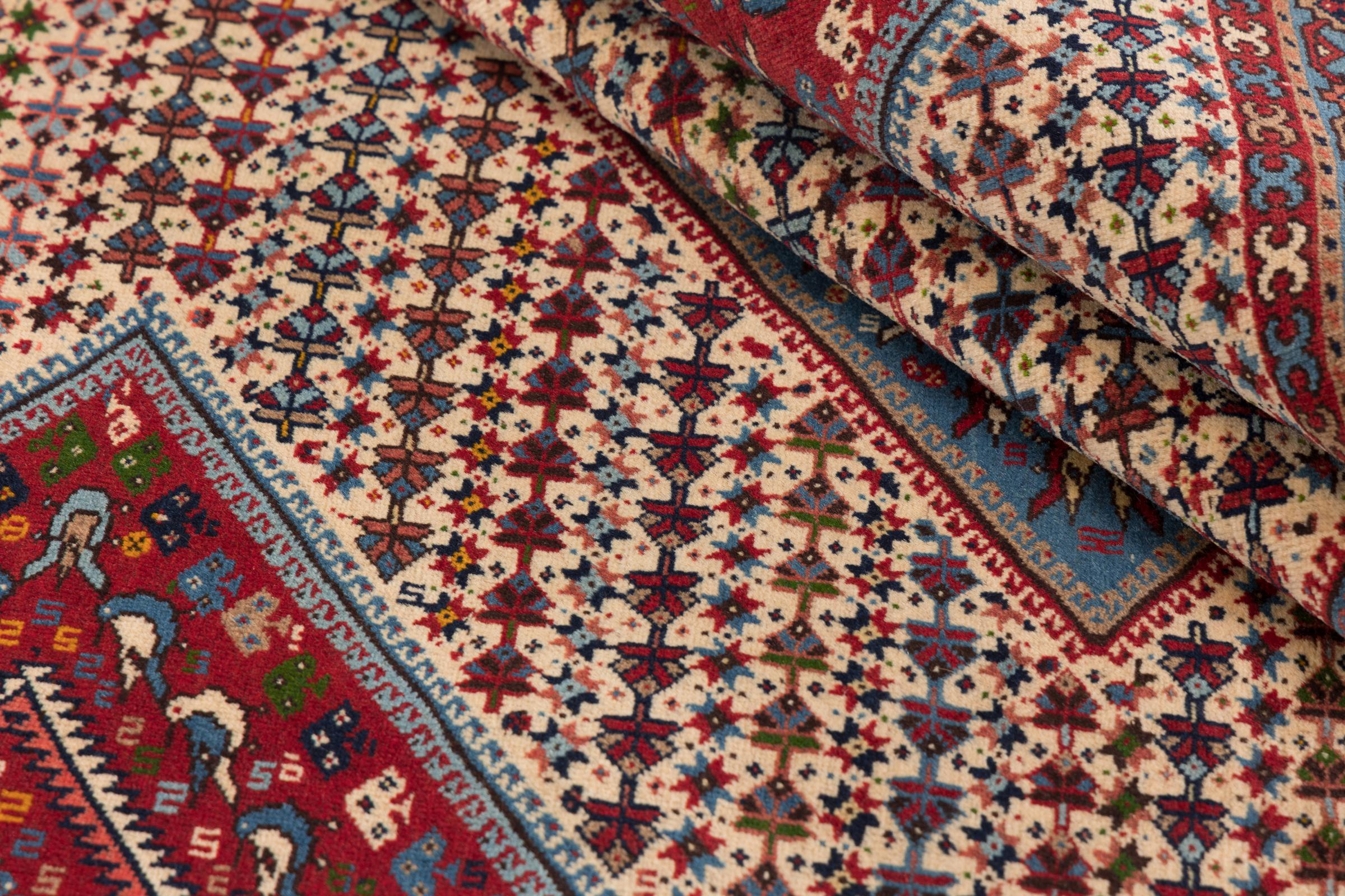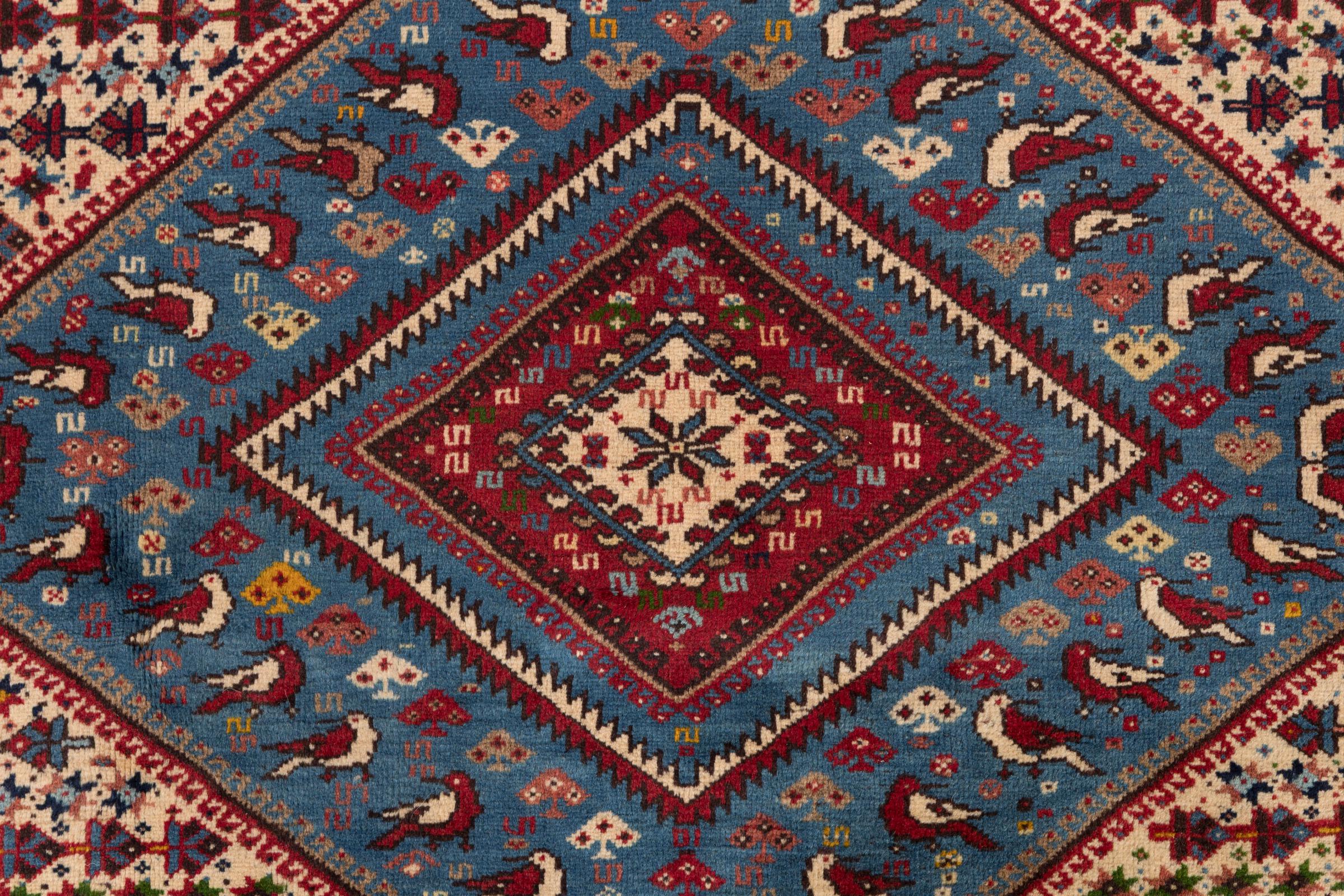 Ce tapis appartient aux tapis de village et de nomade d'Iran, anciennement la Perse. Ce type de tapis est noué à la main dans les petites villes et les villages selon l'ancienne tradition. Même les nomades nouent encore des tapis persans en plein air. Les tapis sont noués sans schéma et entièrement à partir de la tête. Ils se caractérisent par des ornements classiques, qui sont disposés en motifs droits et géométriques. Grâce à leur origine culturelle et traditionnelle, ces tapis ont un caractère unique qui incarne la Perse ancienne.